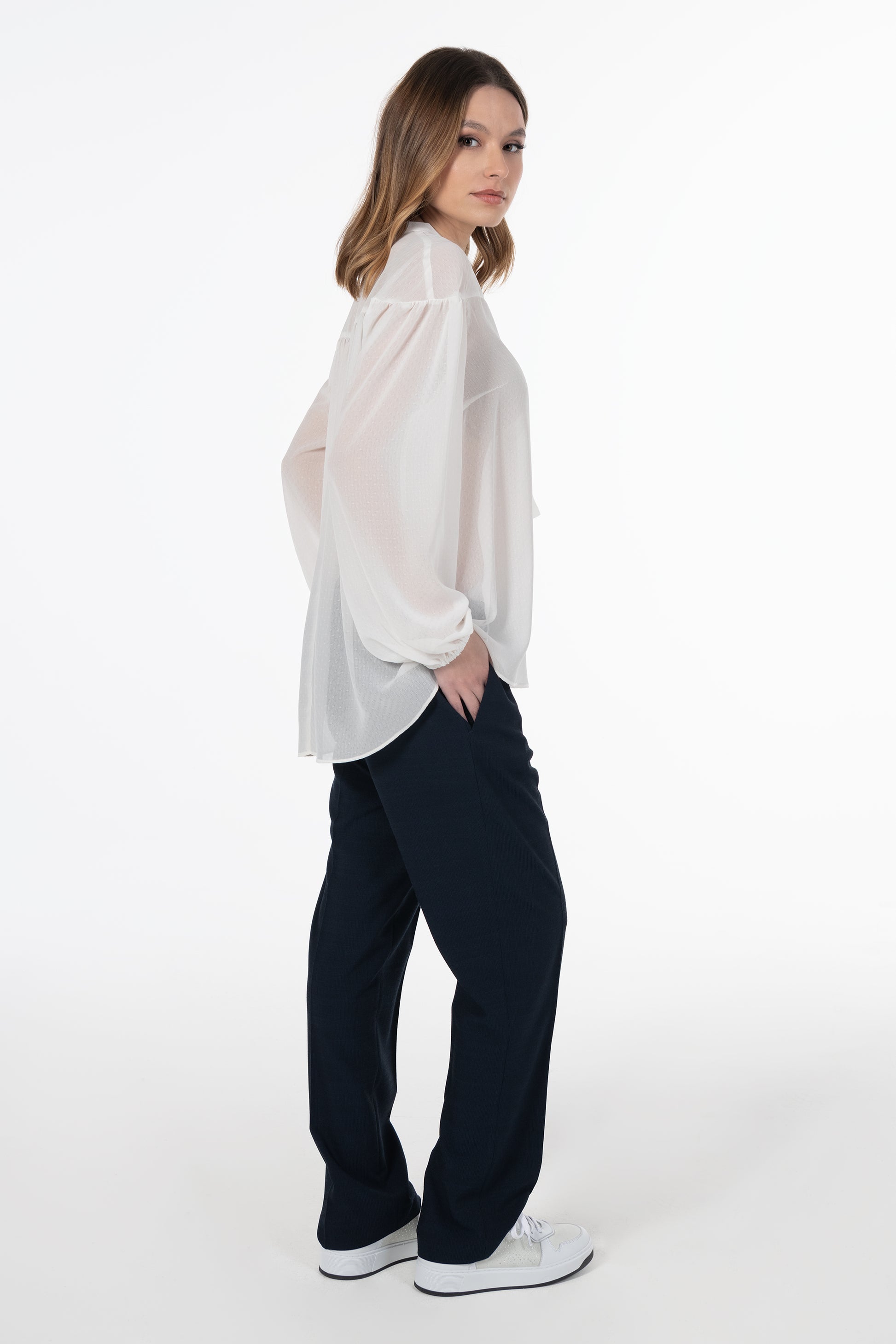 A blusa branca ANA SOUSA apresenta um design elegante e fluido, com tecido leve e transparência subtil que acrescenta sofisticação ao look. O laço no decote e as mangas longas com punho elástico conferem um toque feminino e delicado. Ideal para coordenados de trabalho ou looks refinados, combina perfeitamente com calças clássicas ou saias da coleção ANA SOUSA.