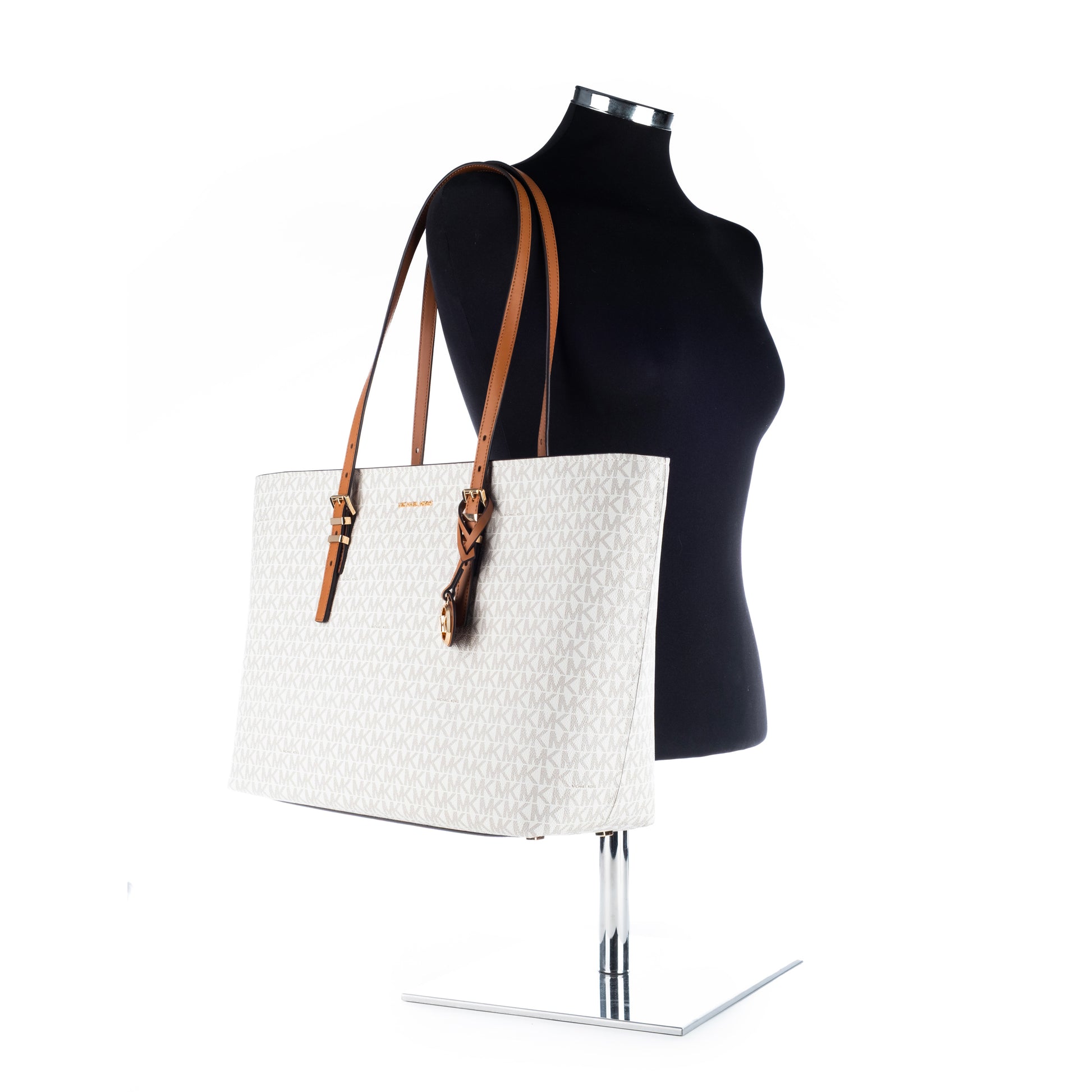 Descobre a elegância desta bolsa Michael Kors, perfeita para o dia a dia e ocasiões especiais. Com um design moderno e espaçoso, apresenta um padrão bege icônico com alças caramelo ajustáveis. Fabricada em materiais de alta qualidade para durabilidade