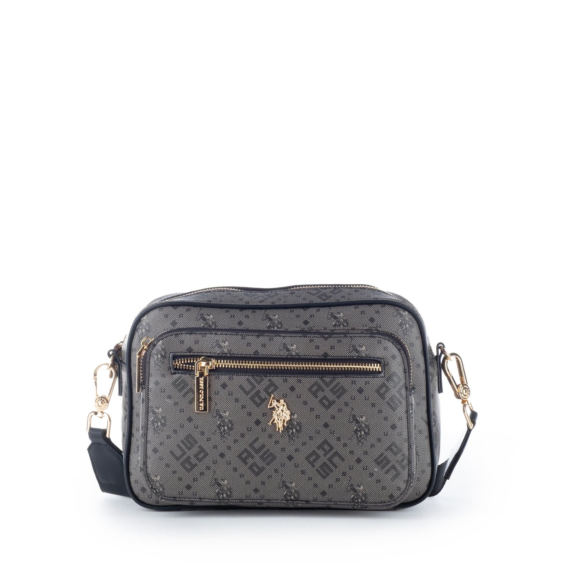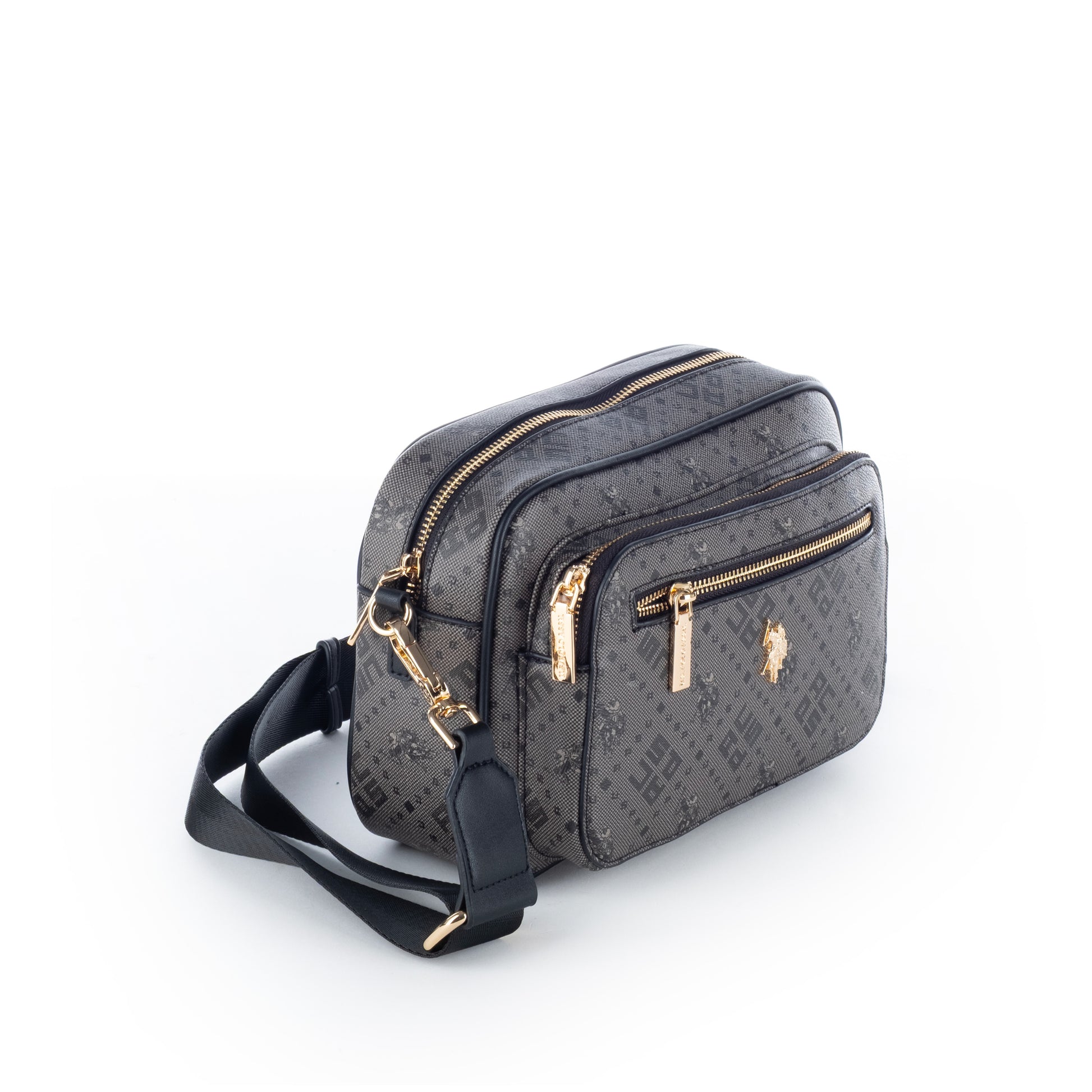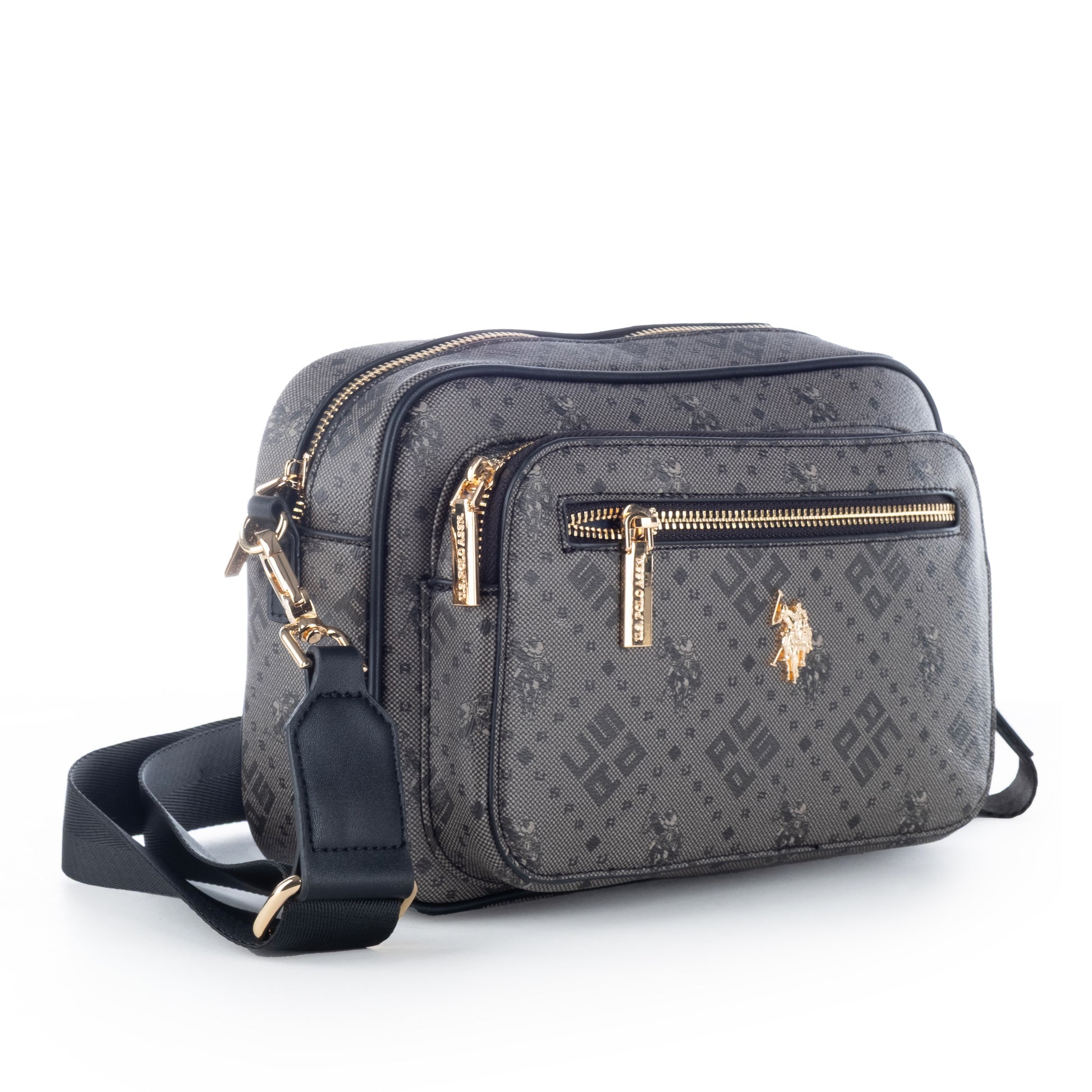 Esta bolsa tiracolo US Polo em cinza apresenta um design compacto e elegante, com padrão monograma, detalhes metálicos dourados e múltiplos bolsos com zíper. Prática e versátil, é ideal para o uso diário, oferecendo funcionalidade com um estilo moderno.