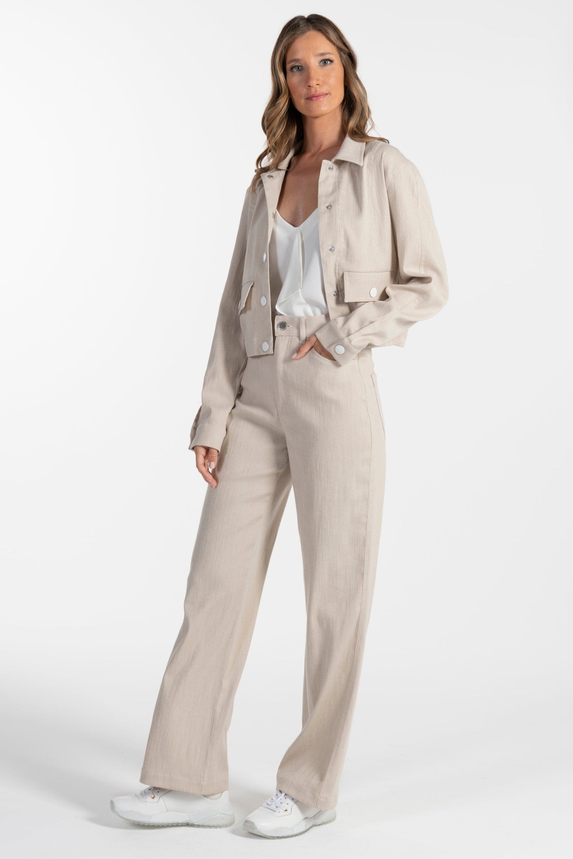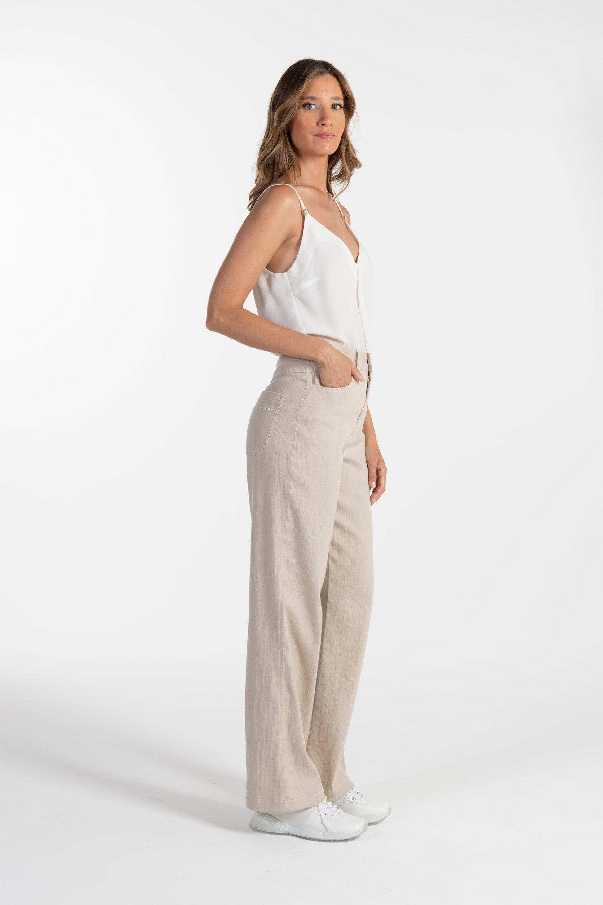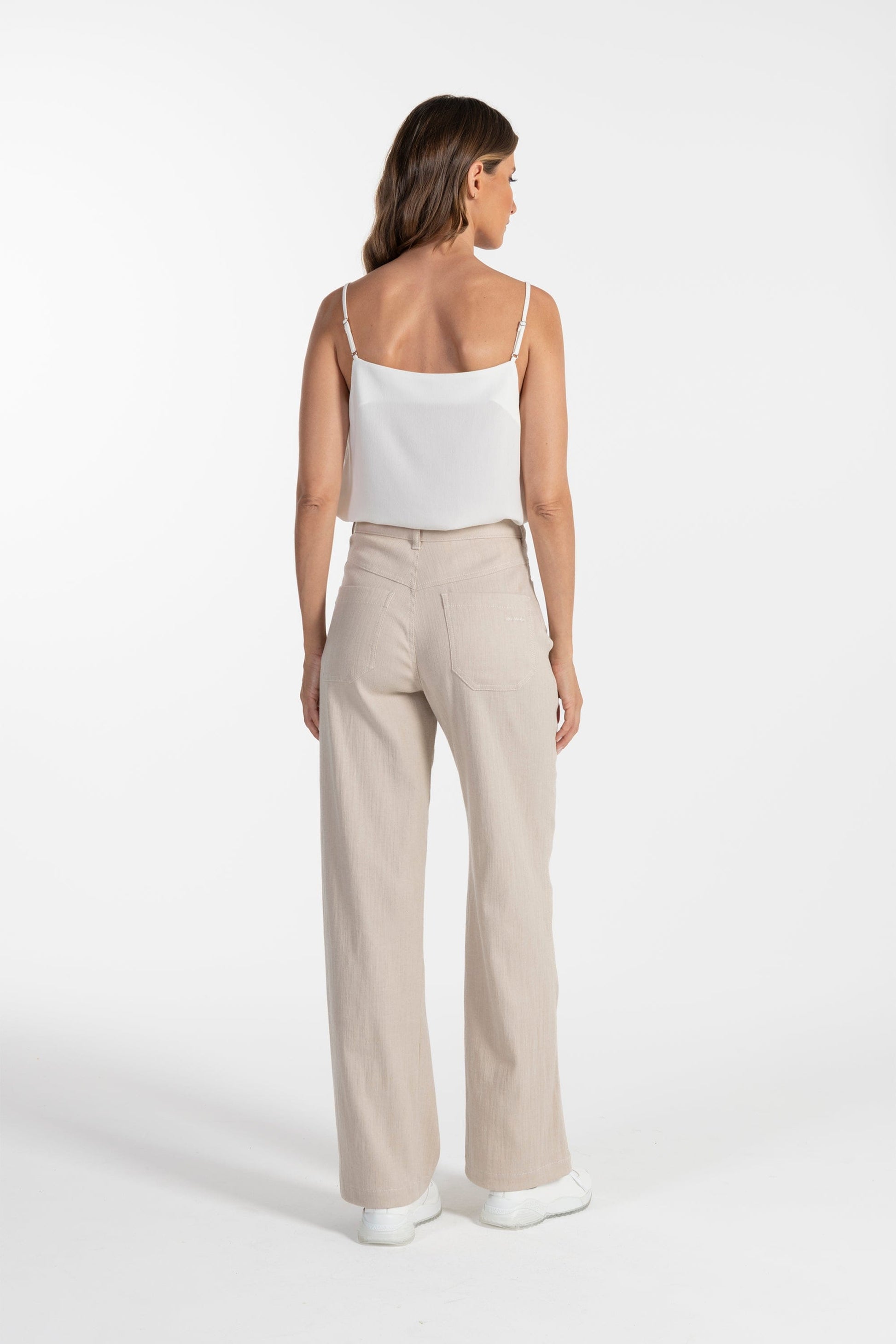 As Calças Ana Sousa são elegantes e versáteis, perfeitas para qualquer ocasião. Com um design de cintura alta e corte reto, oferecem conforto e estilo. Feitas em tecido leve e de cor bege neutra, são ideais para combinar com várias peças