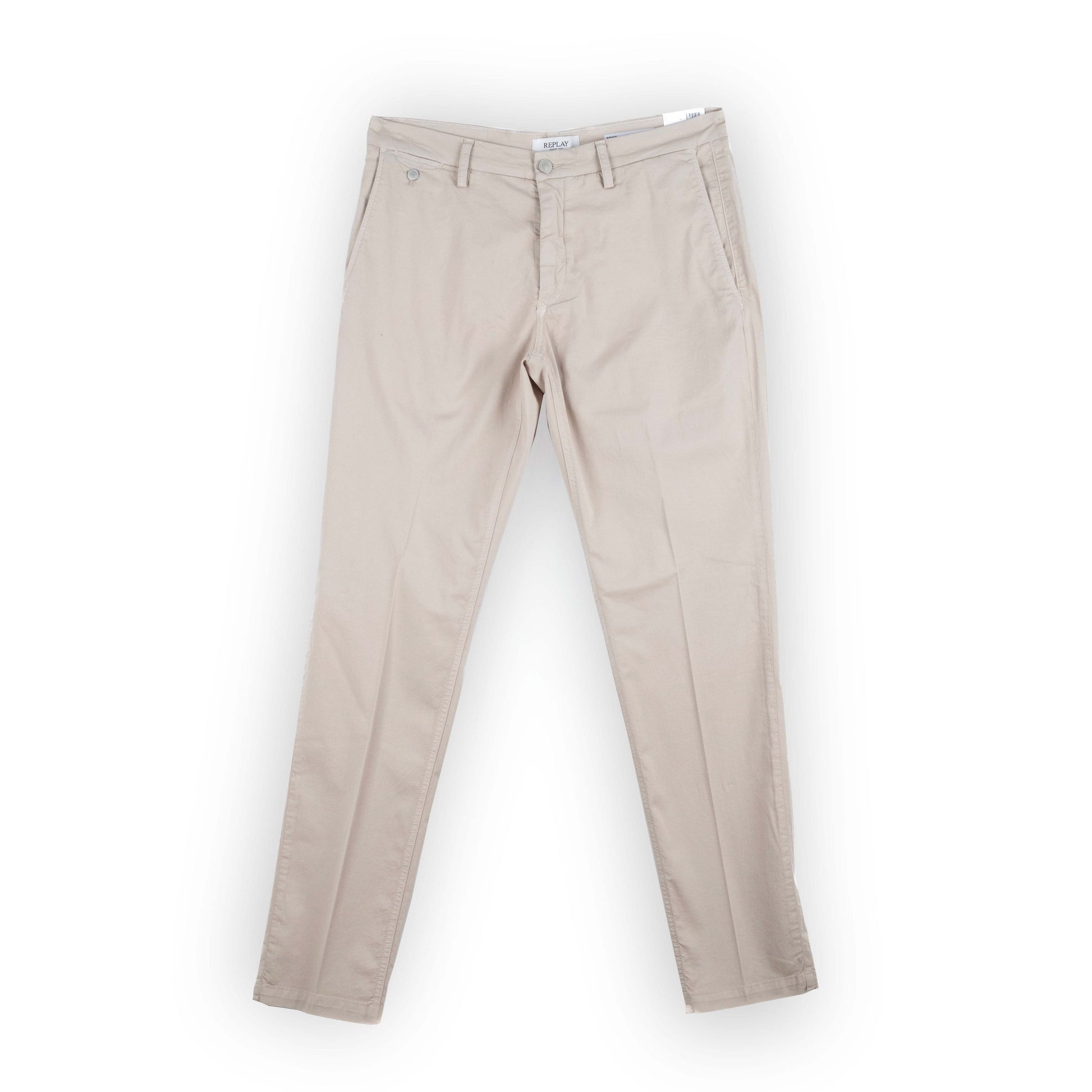 Elegância casual com um toque contemporâneo: estas calças chino da Replay são ideais para o homem moderno. Com corte slim e tom bege claro, combinam facilmente com polos, camisas ou t-shirts, sendo perfeitas tanto para o trabalho como para um look de fim de semana. O tecido em algodão com elastano garante conforto ao longo do dia.