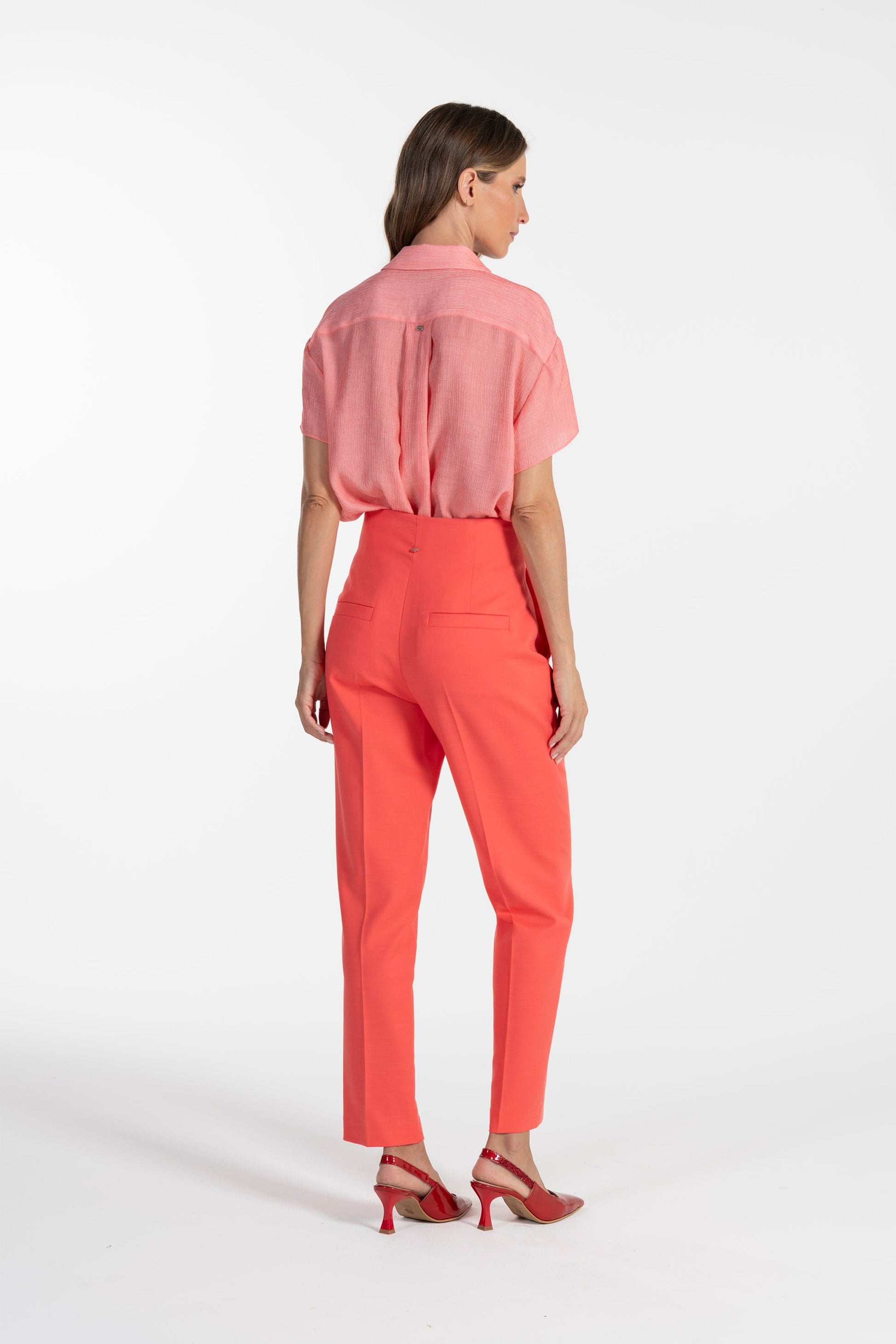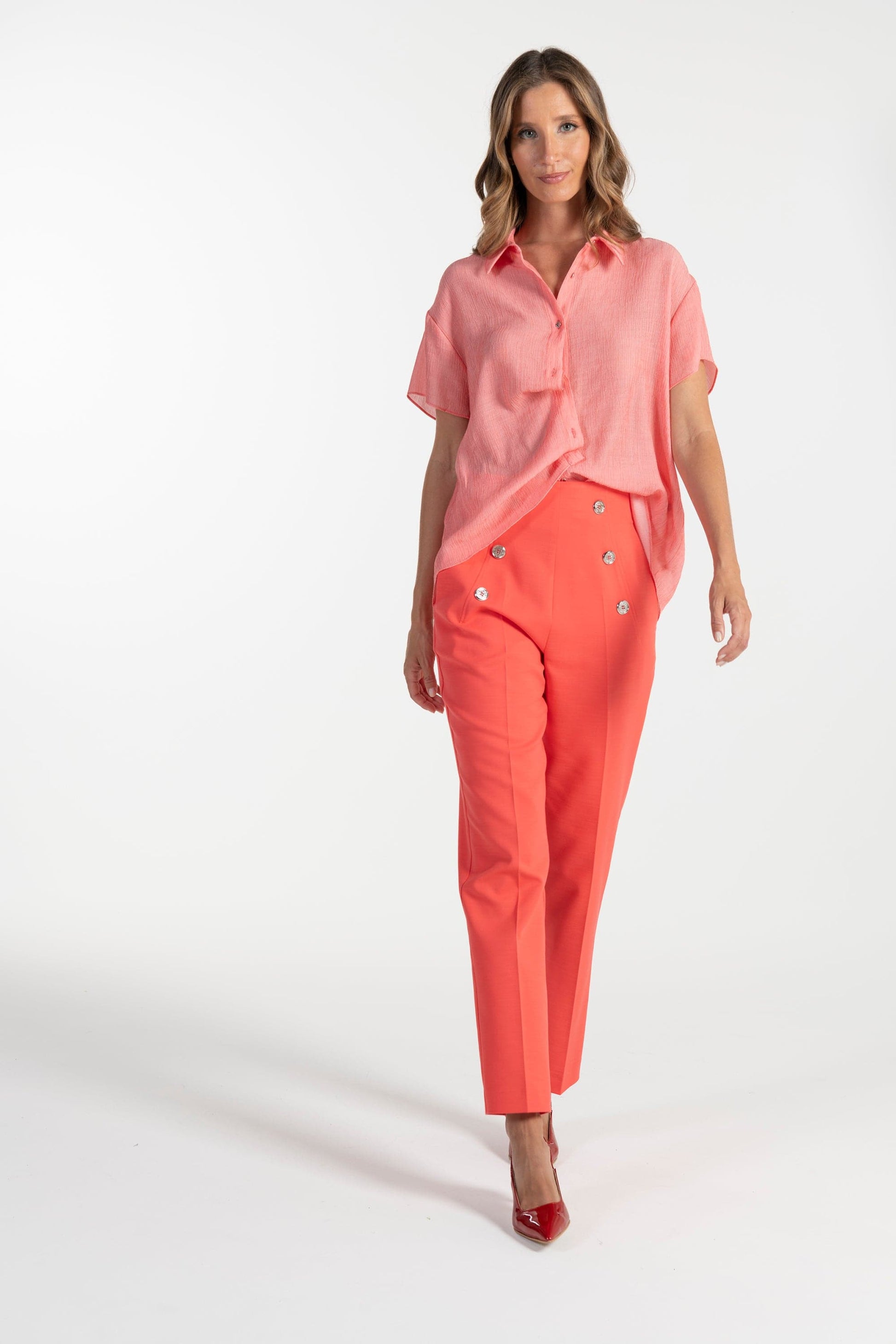 As calças coral ANA SOUSA destacam-se pela cor vibrante e pelos botões decorativos na frente, que adicionam um toque de elegância moderna. Com cintura subida e corte reto, valorizam a silhueta feminina com um estilo sofisticado e contemporâneo. Ideais para coordenados de verão ou para dar um toque de cor ao look do dia. Combina-as com camisas neutras ou blusas estampadas da nova coleção ANA SOUSA.