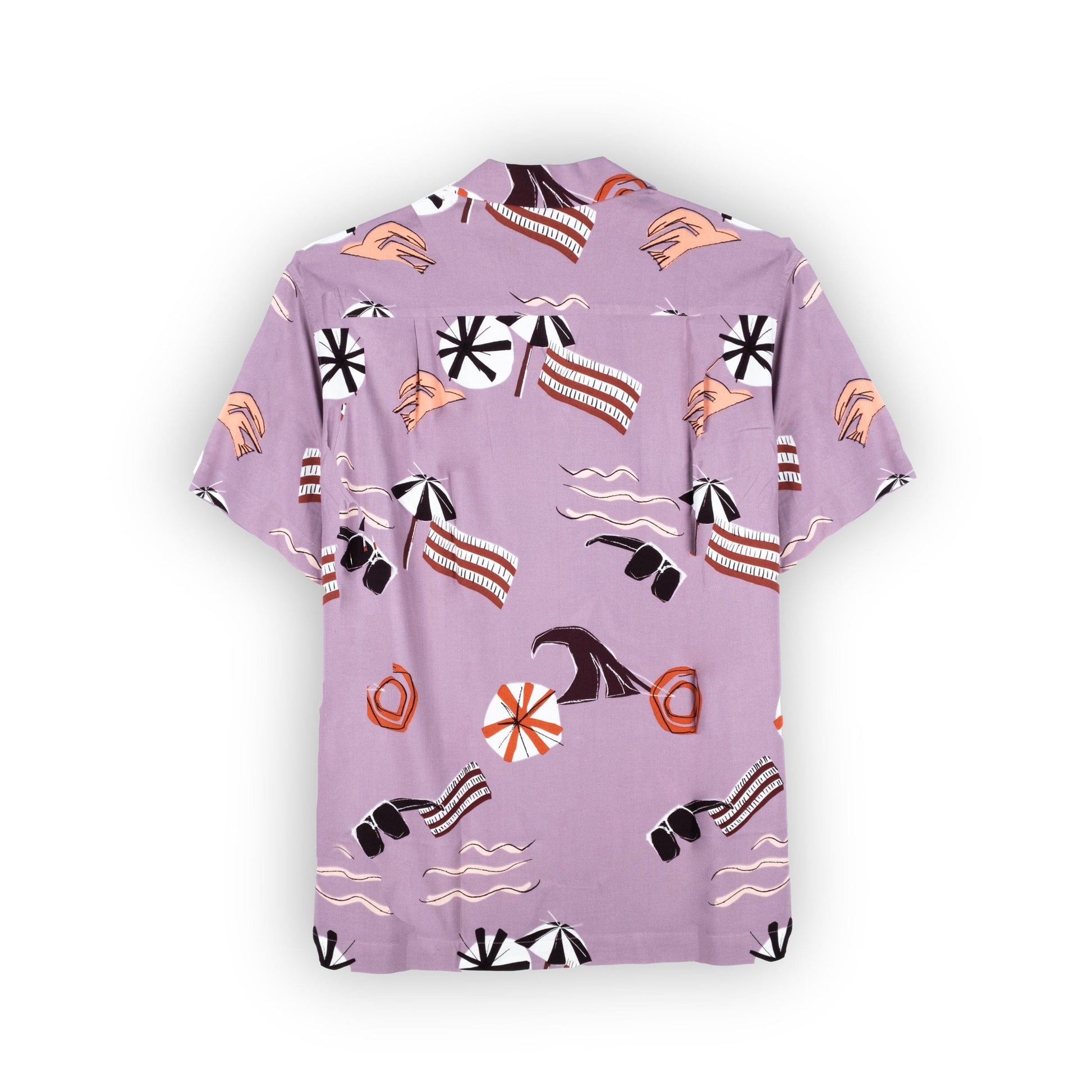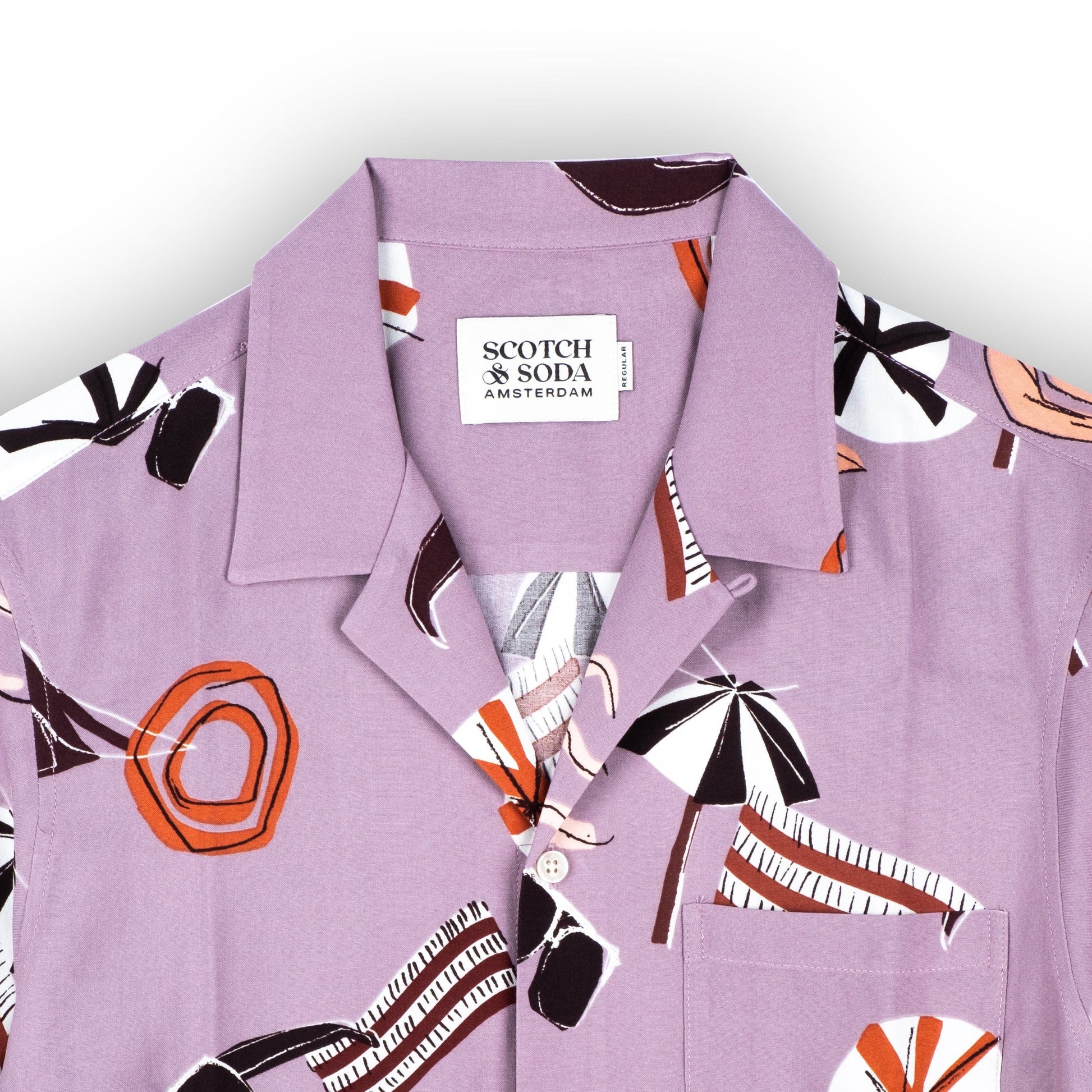Camisa masculina da Scotch & Soda, perfeita para um verão descontraído. Feita em tecido leve, conta com uma estampa divertida de elementos como guarda-sóis e óculos de sol, em um tom vibrante de roxo. Ideal para combinar com jeans ou shorts, proporcionando conforto e estilo