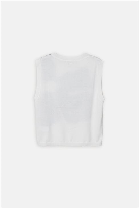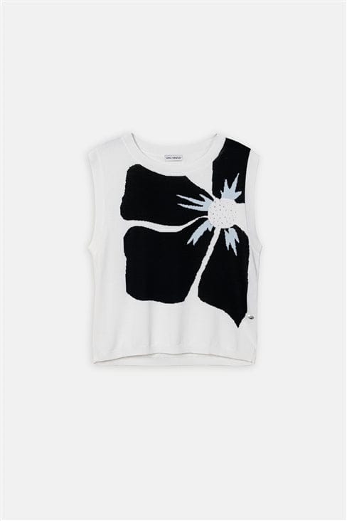 Camisola elegante da marca Ana Sousa, ideal para um visual moderno e sofisticado. Apresenta um design floral em preto e branco, sem mangas, perfeita para qualquer ocasião. Material de alta qualidade que garante conforto e durabilidade