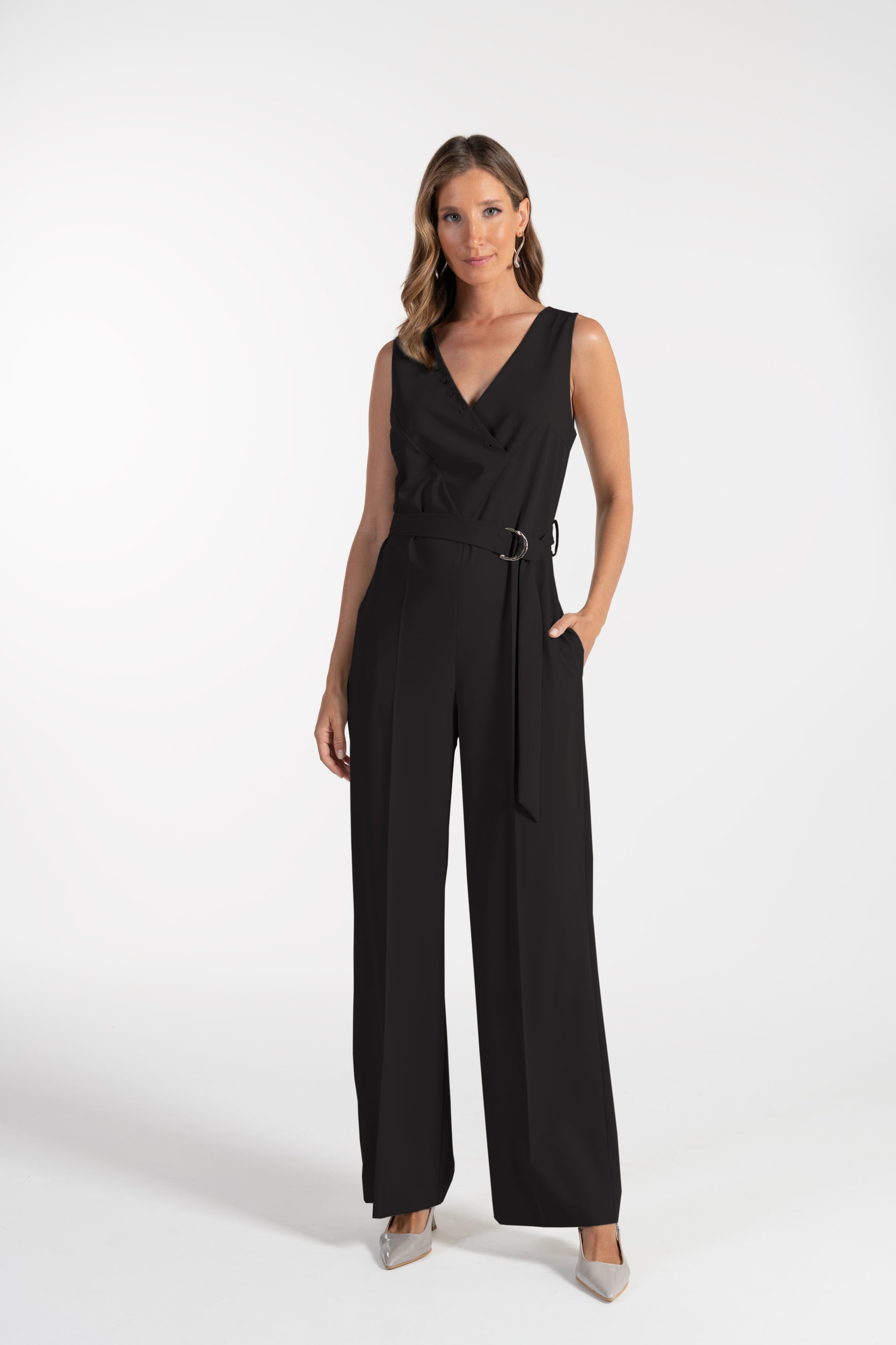 O jumpsuit preto ANA SOUSA apresenta um design elegante e moderno, com decote cruzado que valoriza a silhueta e um cinto ajustável que acrescenta definição à cintura. O corte fluido das pernas oferece movimento e sofisticação, tornando esta peça perfeita para eventos, ocasiões especiais ou looks de noite com um toque refinado.