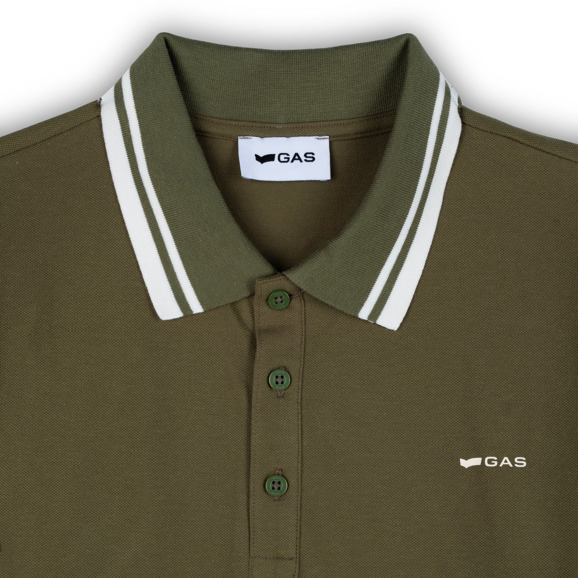 Polo masculino de alta qualidade da marca Gas, na cor verde elegante. Apresenta um design clássico com gola e botões, proporcionando um visual casual e sofisticado. Ideal para o dia a dia, confeccionado em tecido leve e respirável para máximo conforto