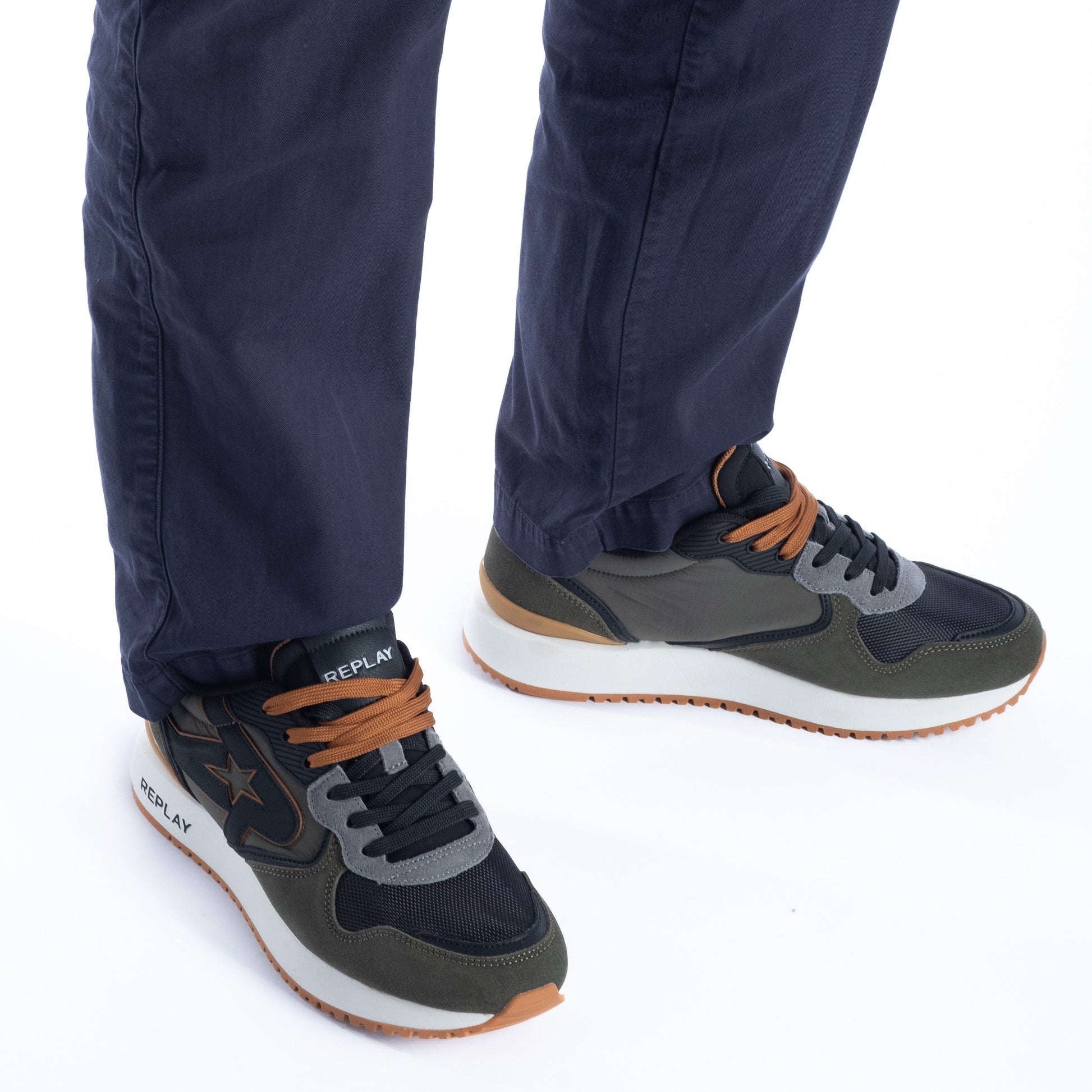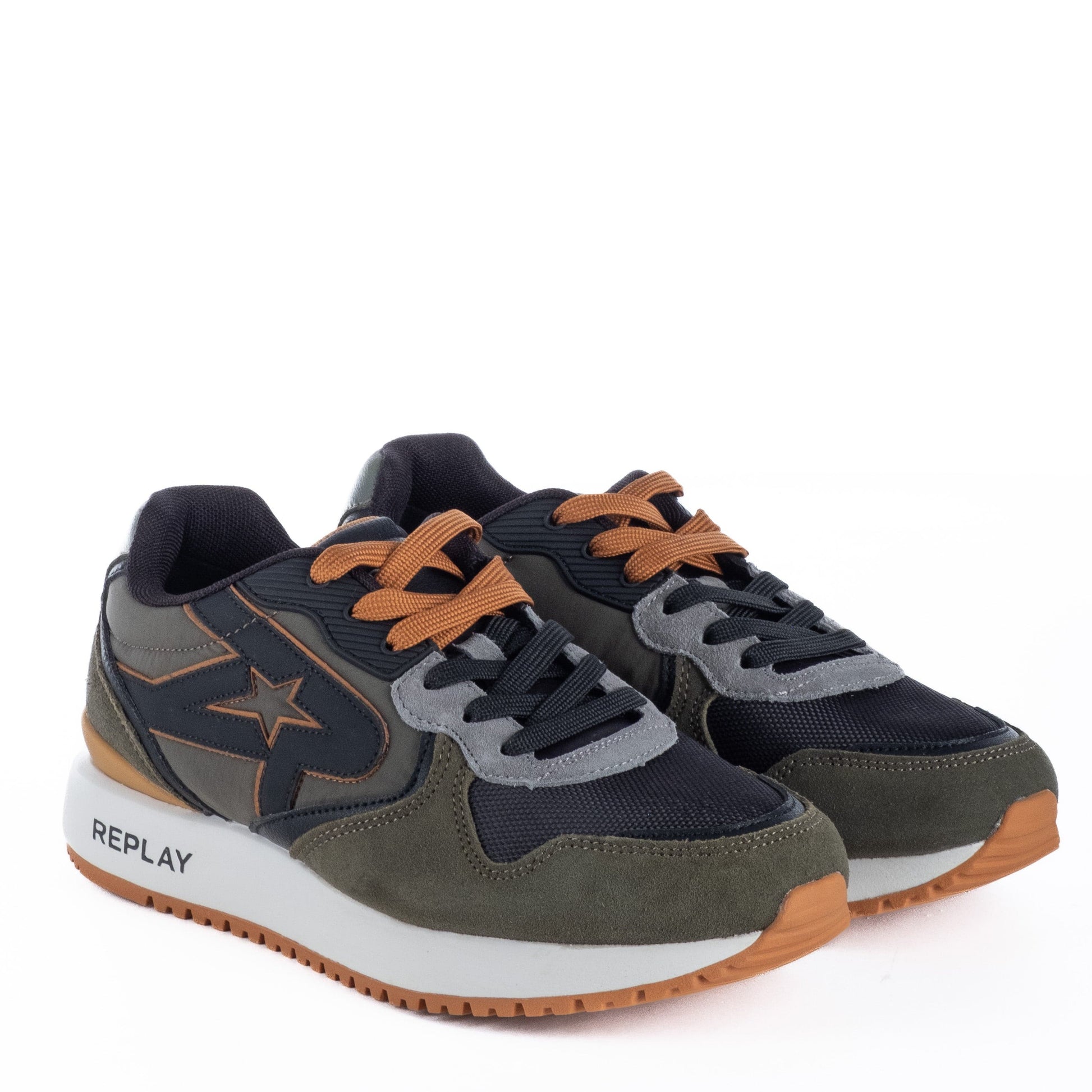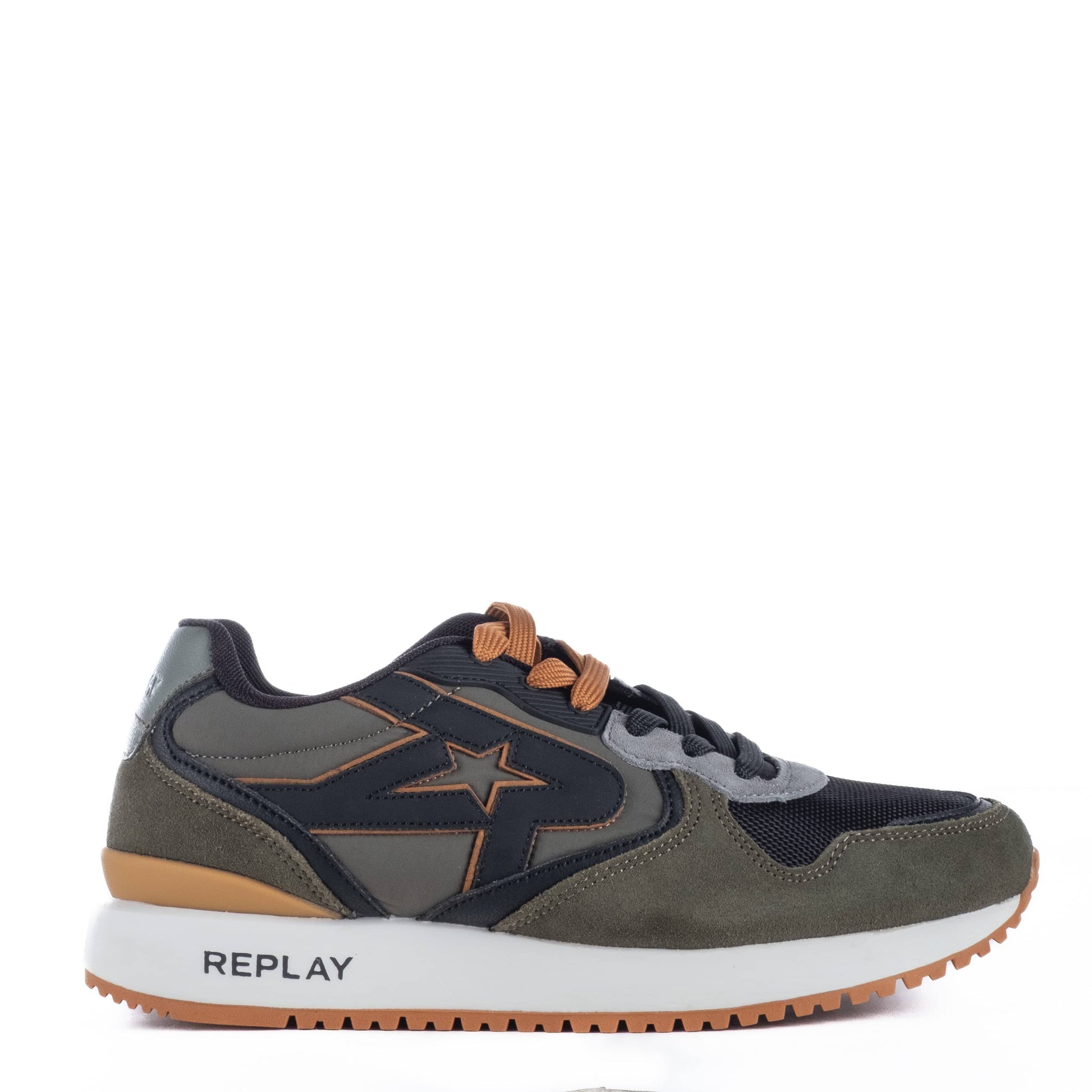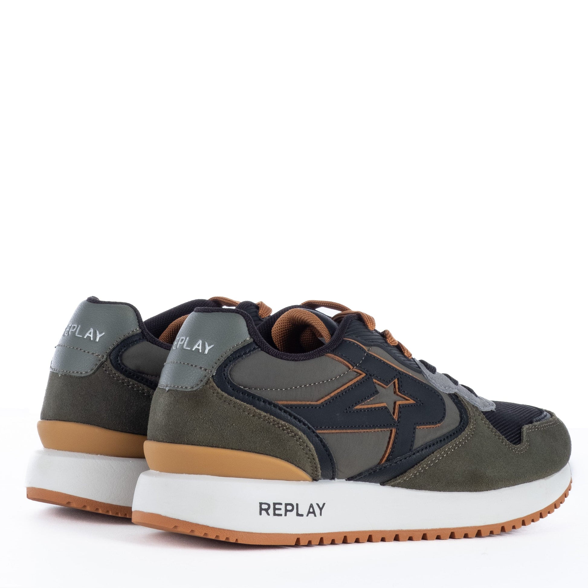 Estrela lateral estilizada e assinatura REPLAY no calcanhar e entressola
