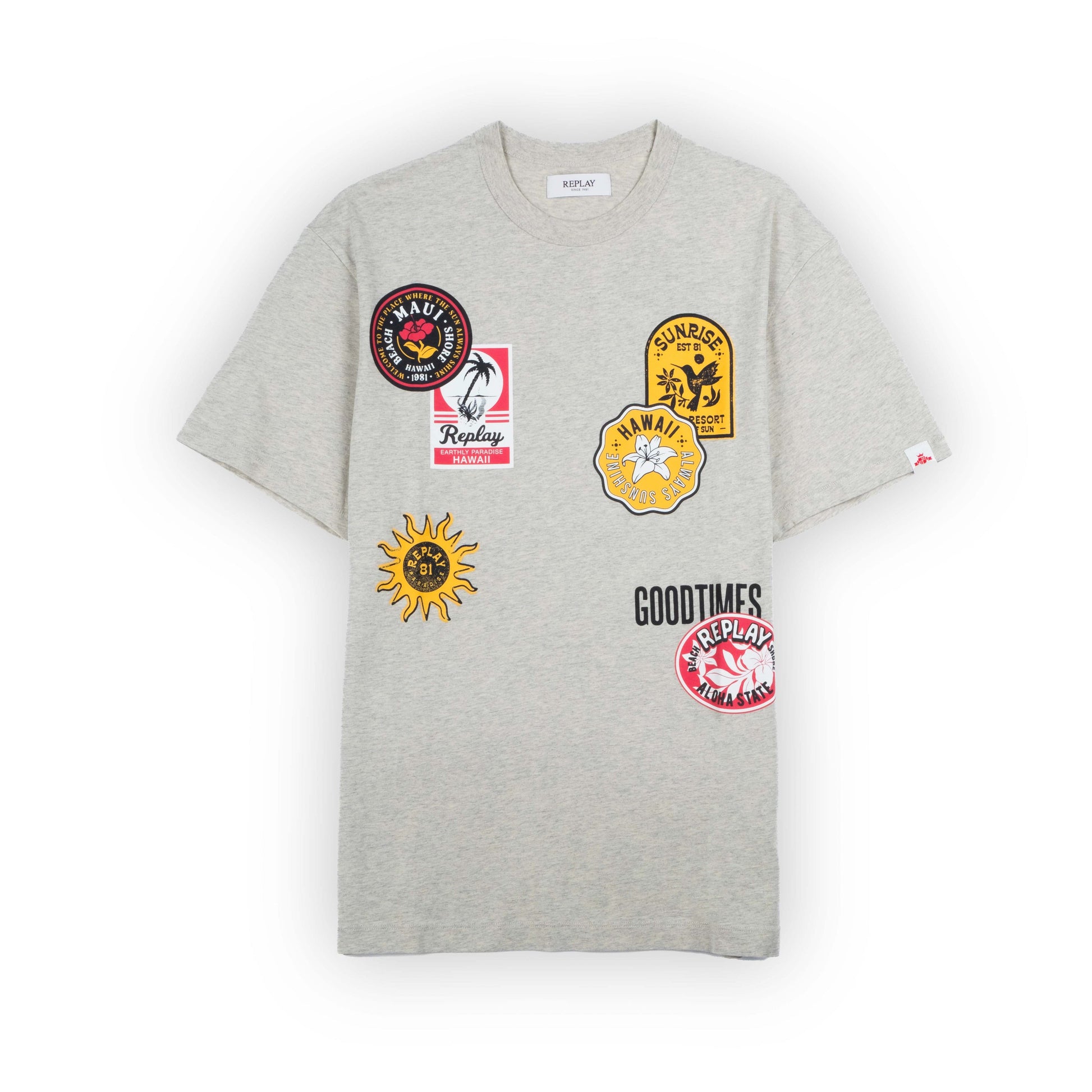Para quem gosta de estilo com personalidade, esta t-shirt cinzenta da Replay é uma escolha irreverente. Decorada com múltiplos patches coloridos e estampas em estilo vintage, garante um visual arrojado e descontraído. Confortável, moderna e perfeita para destacar-te.