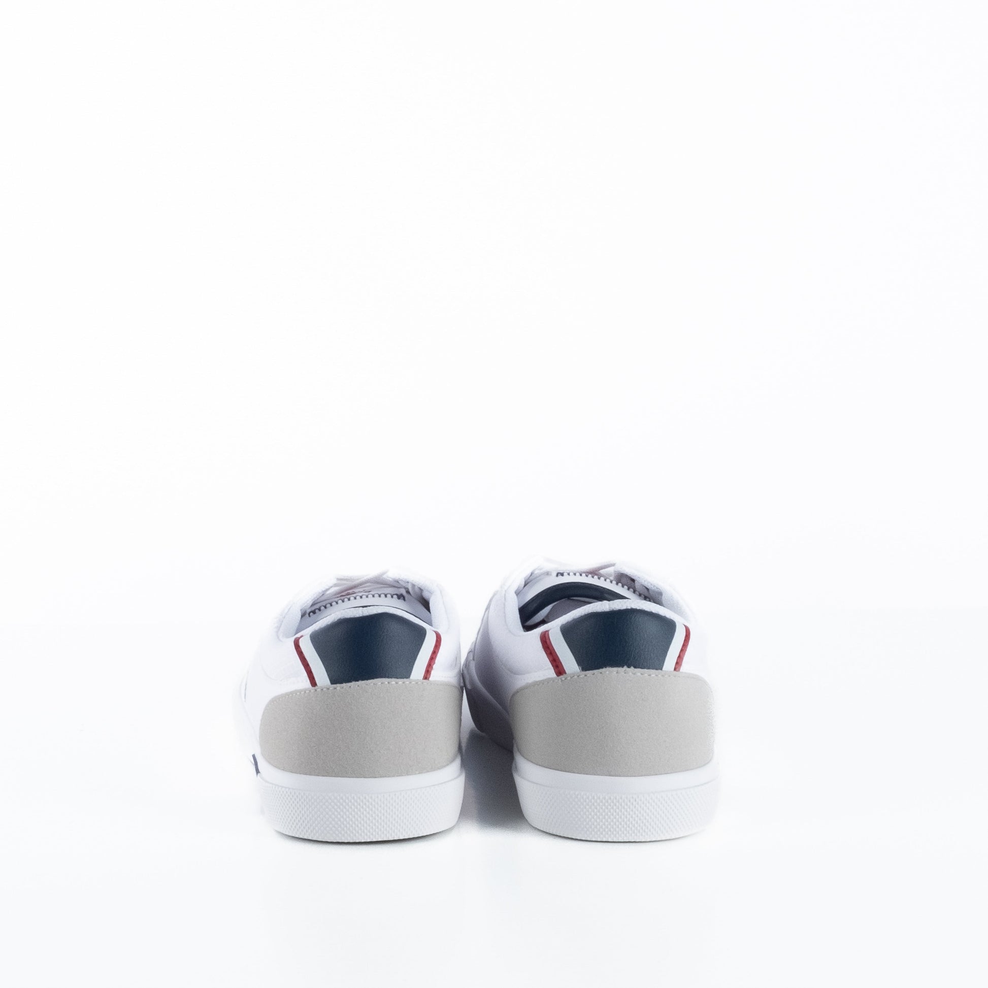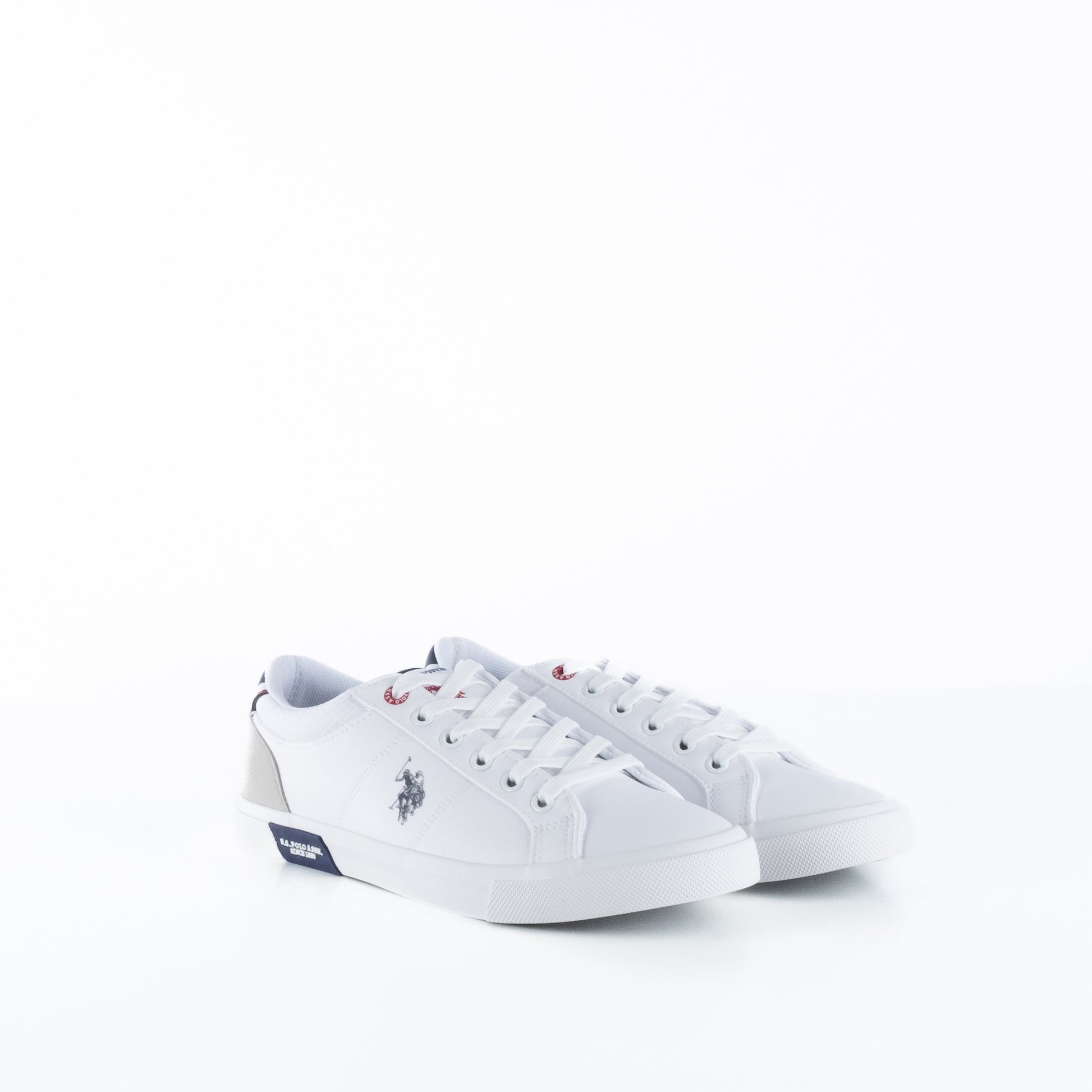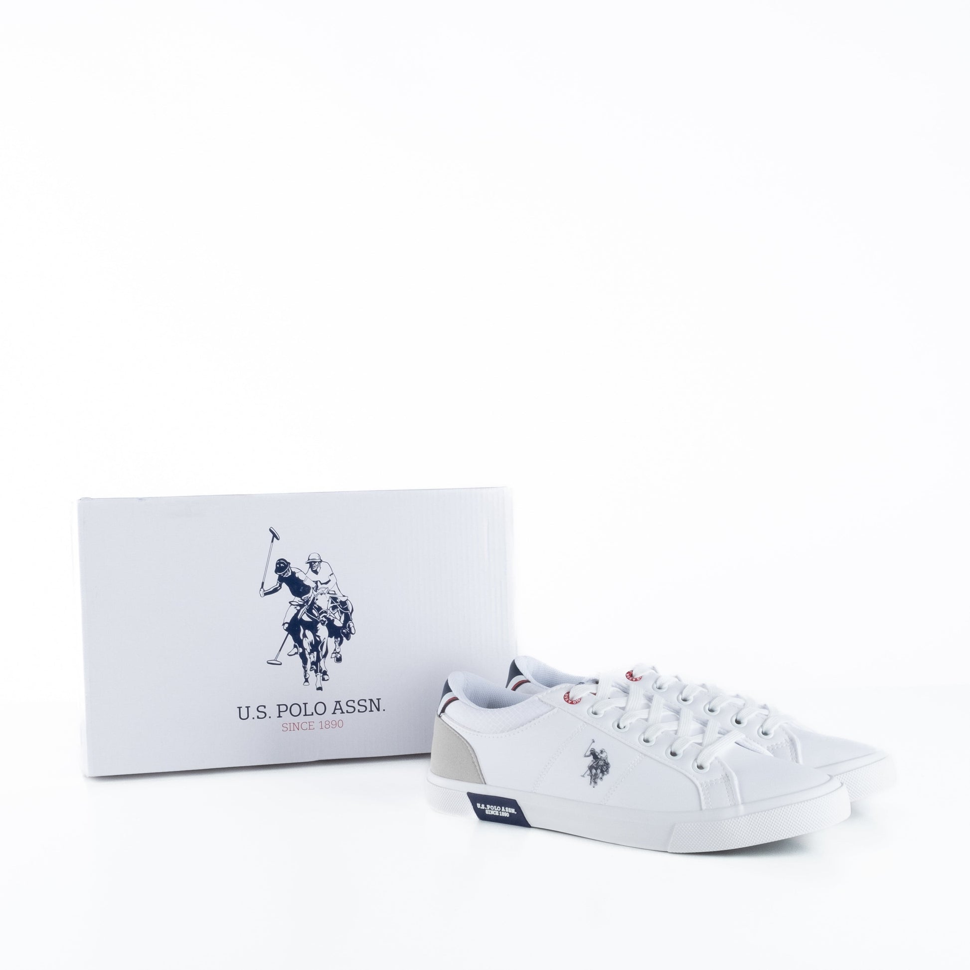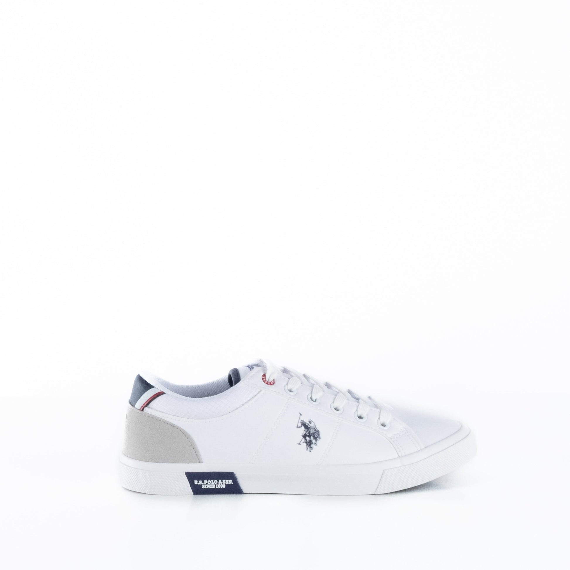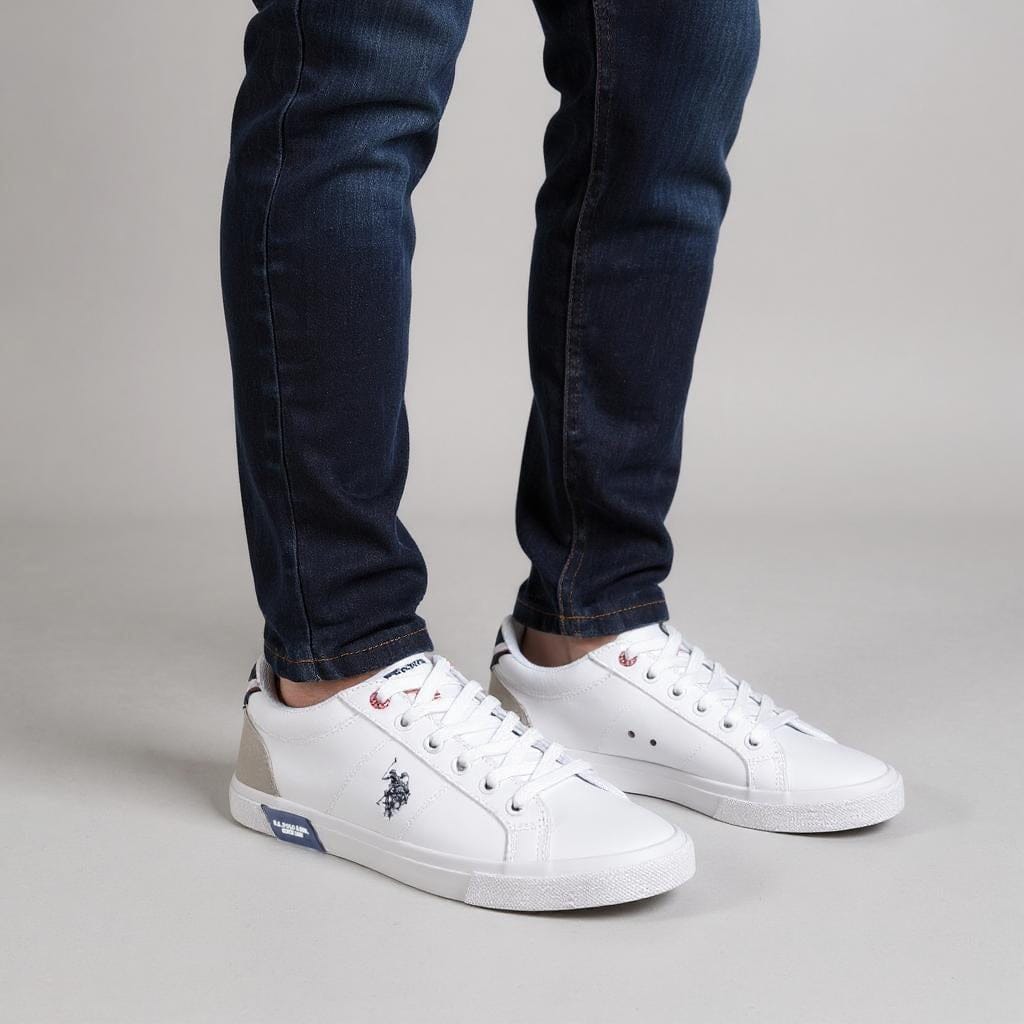 Design clássico com elegância desportiva. Esta versão dos ténis brancos da US Polo Assn. apresenta os mesmos elementos icónicos: logótipo bordado, calcanhar reforçado em cinzento e detalhes azul-marinho. Uma escolha versátil para qualquer ocasião. | - Marca: US Polo Assn. | - Cor: Branco com detalhes cinzento e azul | - Logótipo bordado na lateral | - Fecho em atacadores | - Sola em borracha branca | - Estilo casual e urbano