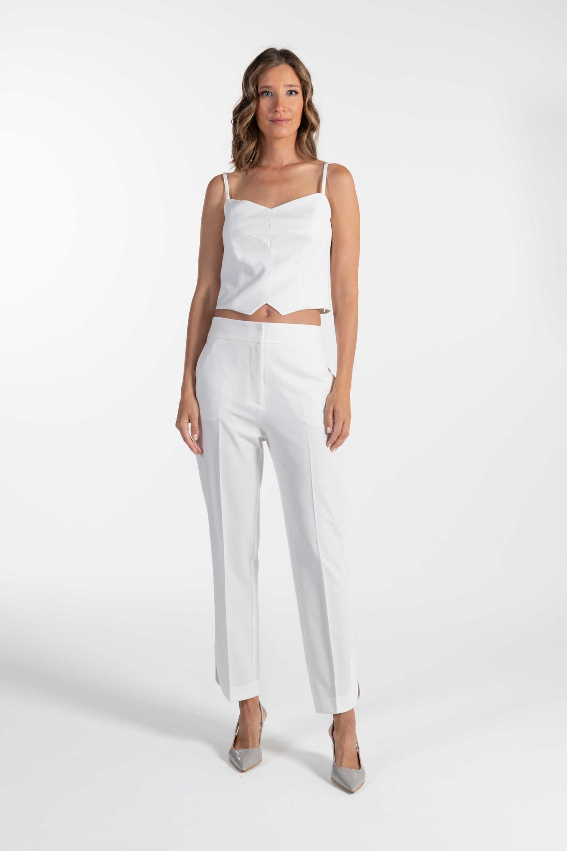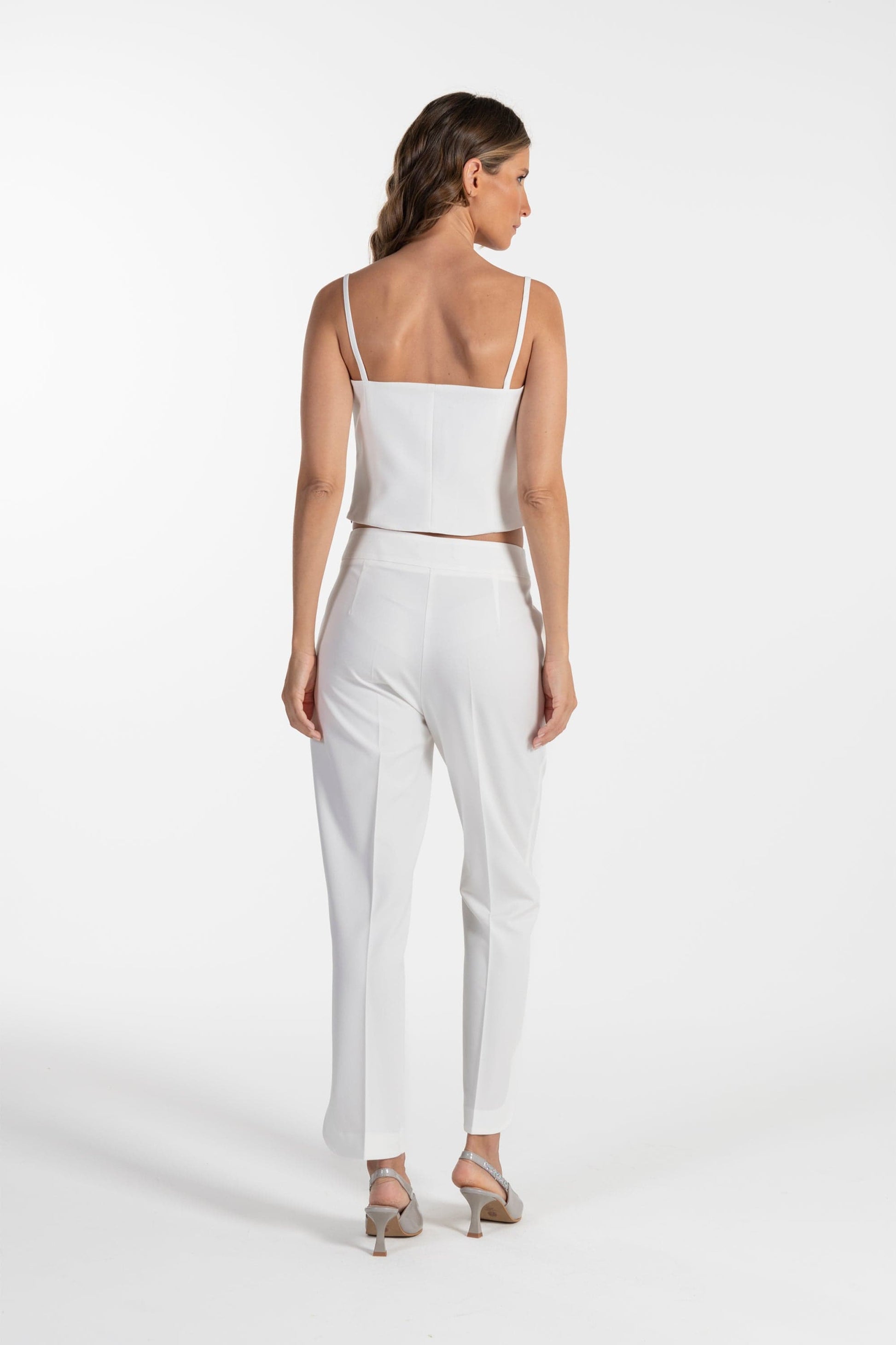 O top branco ANA SOUSA é uma peça essencial de elegância minimalista. Com alças finas e decote ligeiramente drapeado, oferece um toque feminino e sofisticado. O corte reto e o tecido fluido tornam-no ideal para coordenar com calças ou saias da coleção ANA SOUSA, criando um look moderno e refinado.