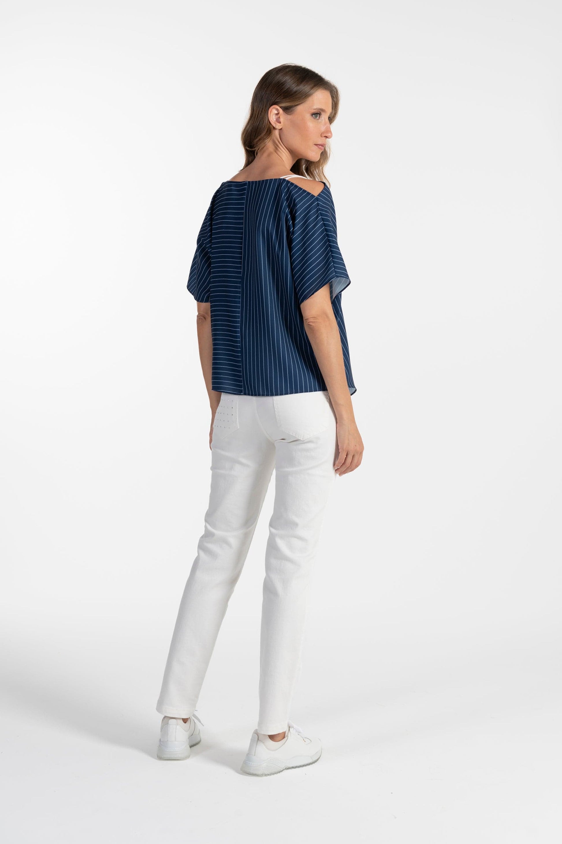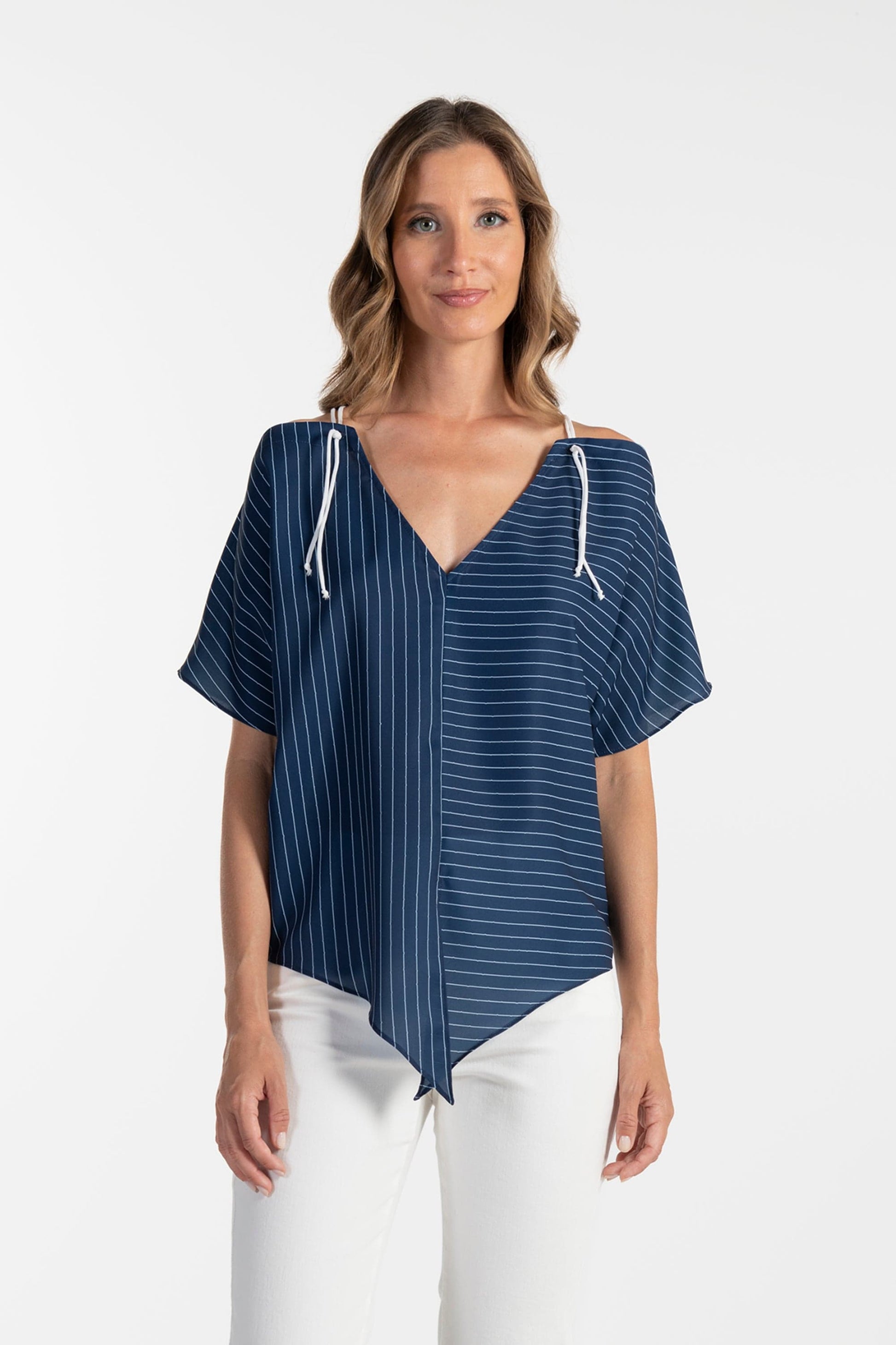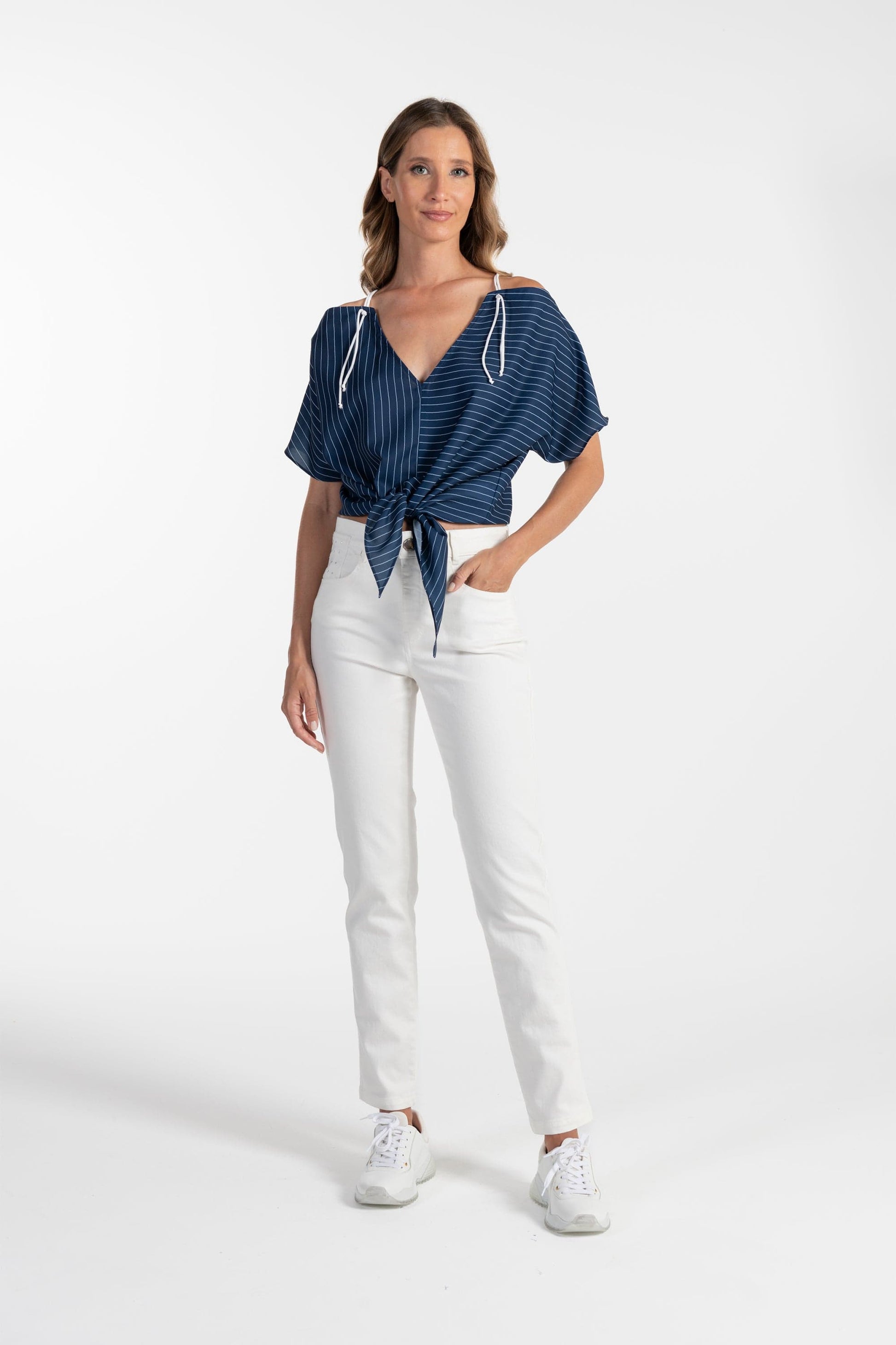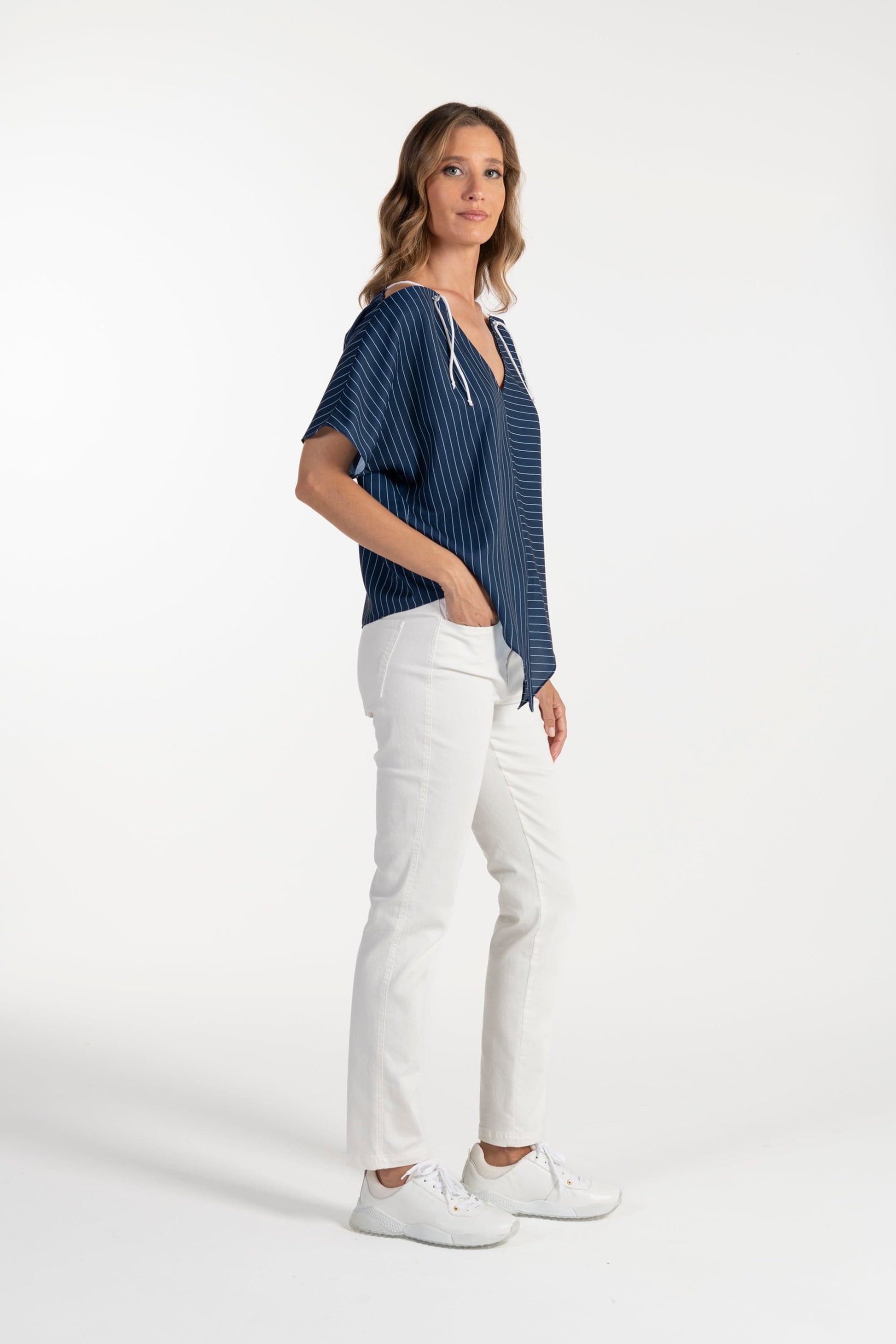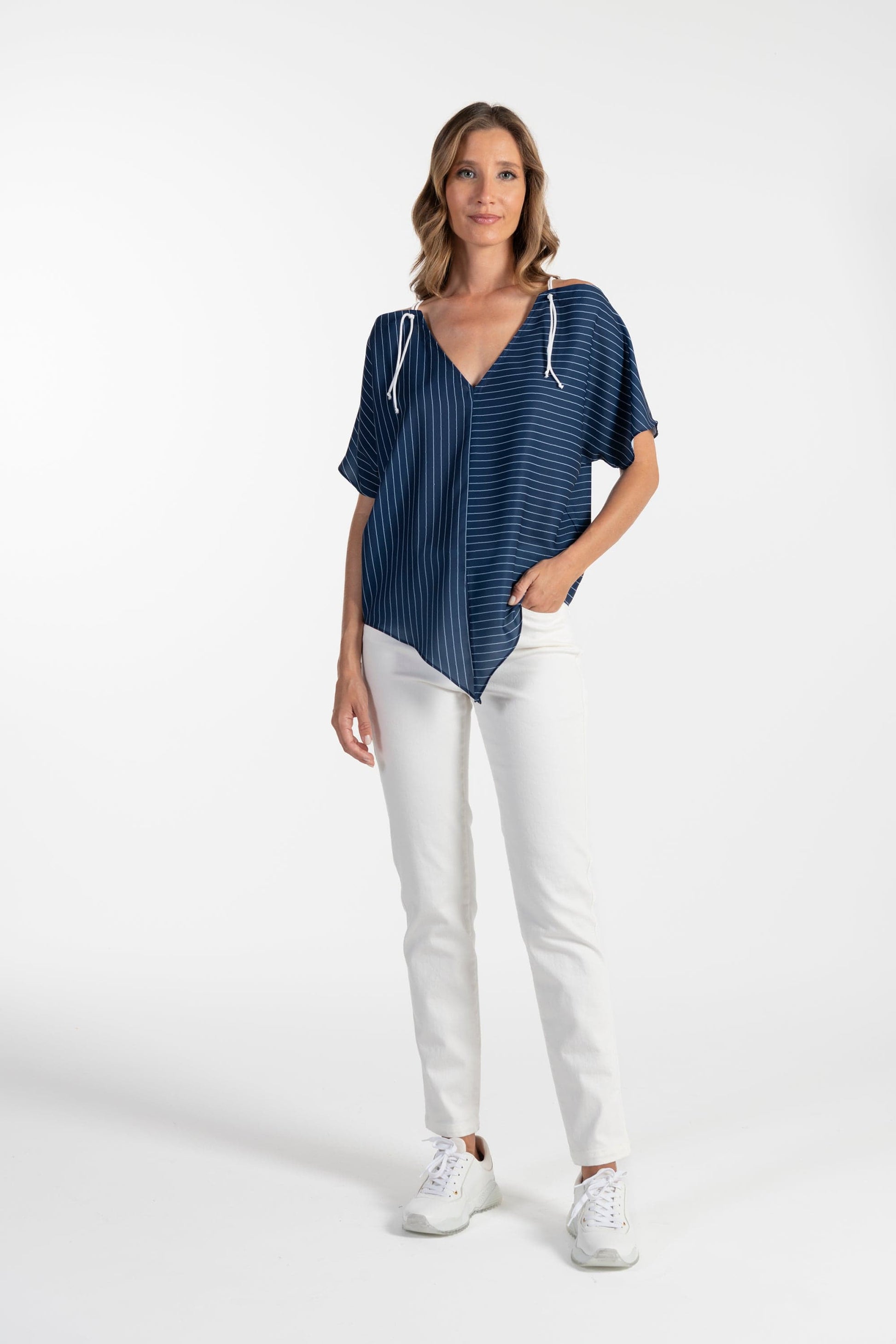 A túnica azul ANA SOUSA é uma peça leve e sofisticada, perfeita para um look elegante e descontraído. Com decote em V, mangas curtas e cordões decorativos, oferece conforto e um toque moderno. O tecido fluido e o corte solto tornam-na ideal para dias de verão ou combinações casuais com calças claras.