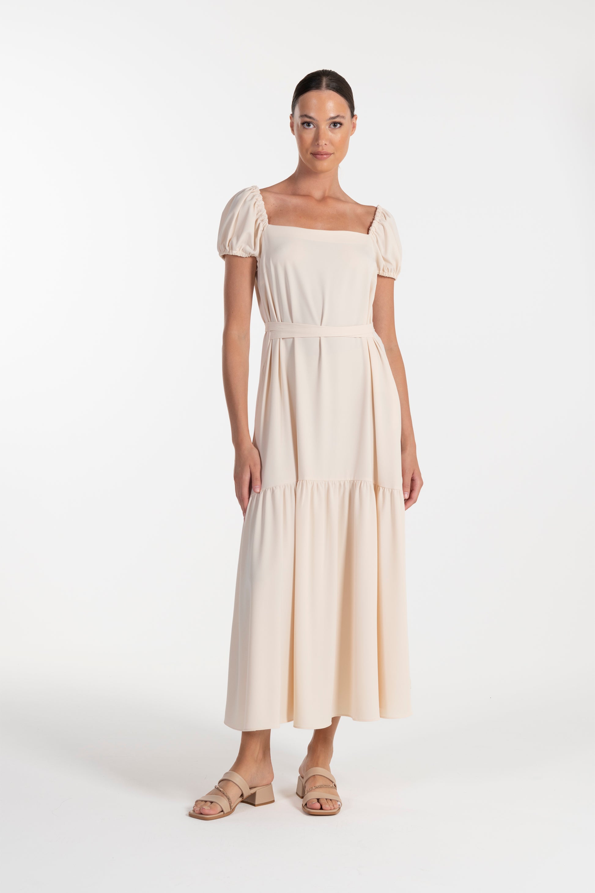 O vestido bege ANA SOUSA apresenta um design leve e elegante, com decote quadrado e mangas curvas que conferem um toque romântico. O corte midi com saia fluida em camadas garante movimento e conforto, tornando este modelo ideal para dias de verão, eventos especiais ou looks femininos do dia a dia.