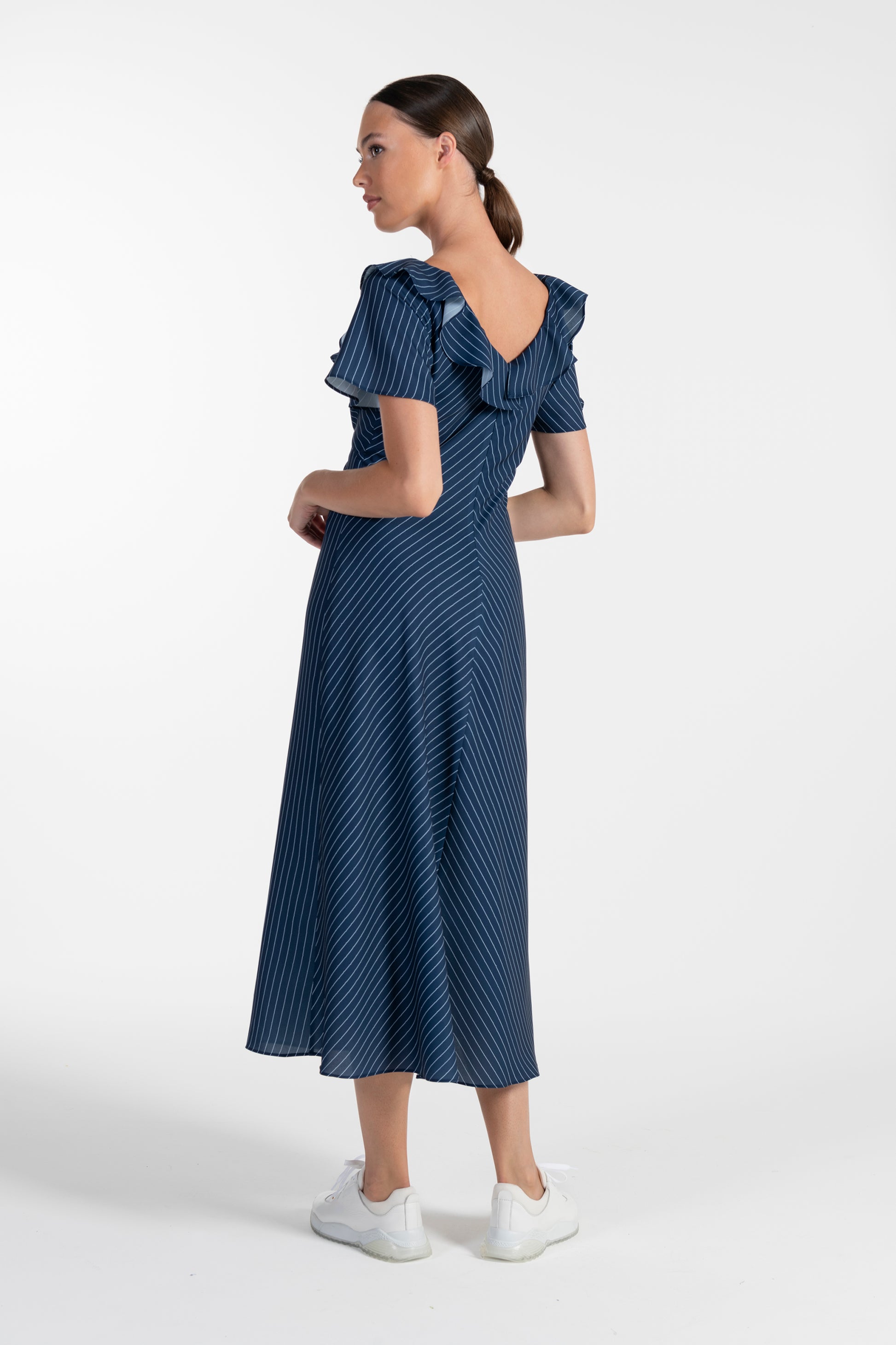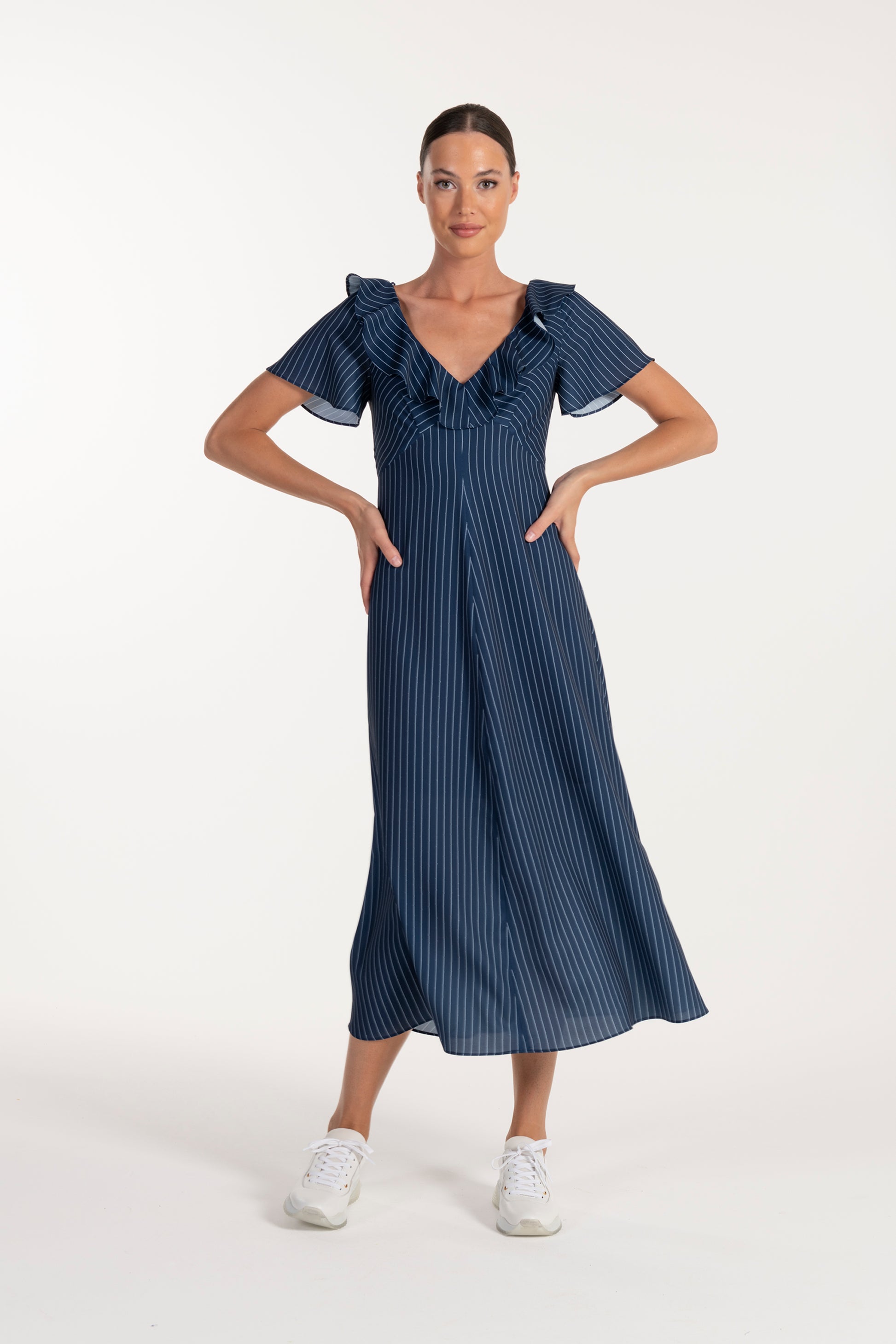 O vestido azul ANA SOUSA combina elegância e frescura num design fluido e feminino. Com decote em V, mangas curvas e botões frontais decorativos, oferece um visual moderno e romântico. O corte midi e o tecido leve garantem conforto e movimento, ideal para dias quentes, eventos casuais ou ocasiões especiais.